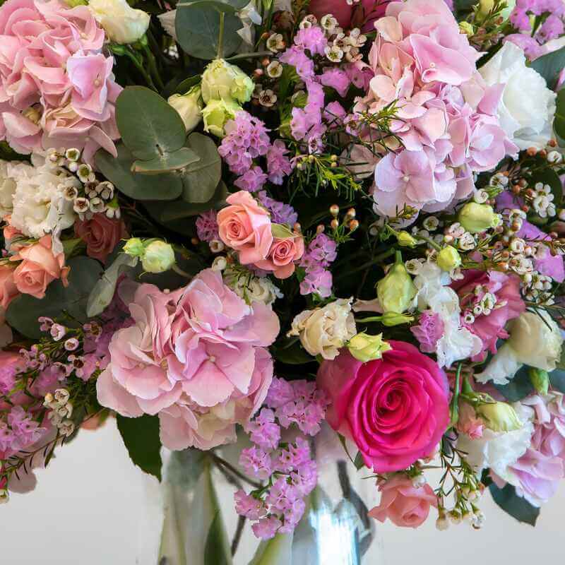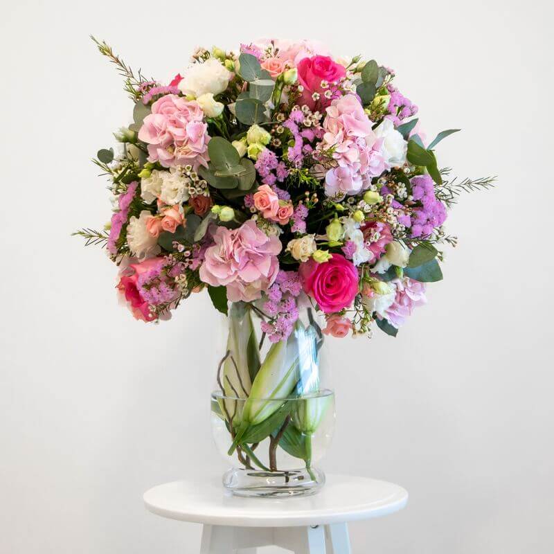 A beautiful round flower arrangement in a glass vase. Designed using pink hydrangea, purple statice, pink roses, white wax flower, pink spray rose and a mixture of foliage.