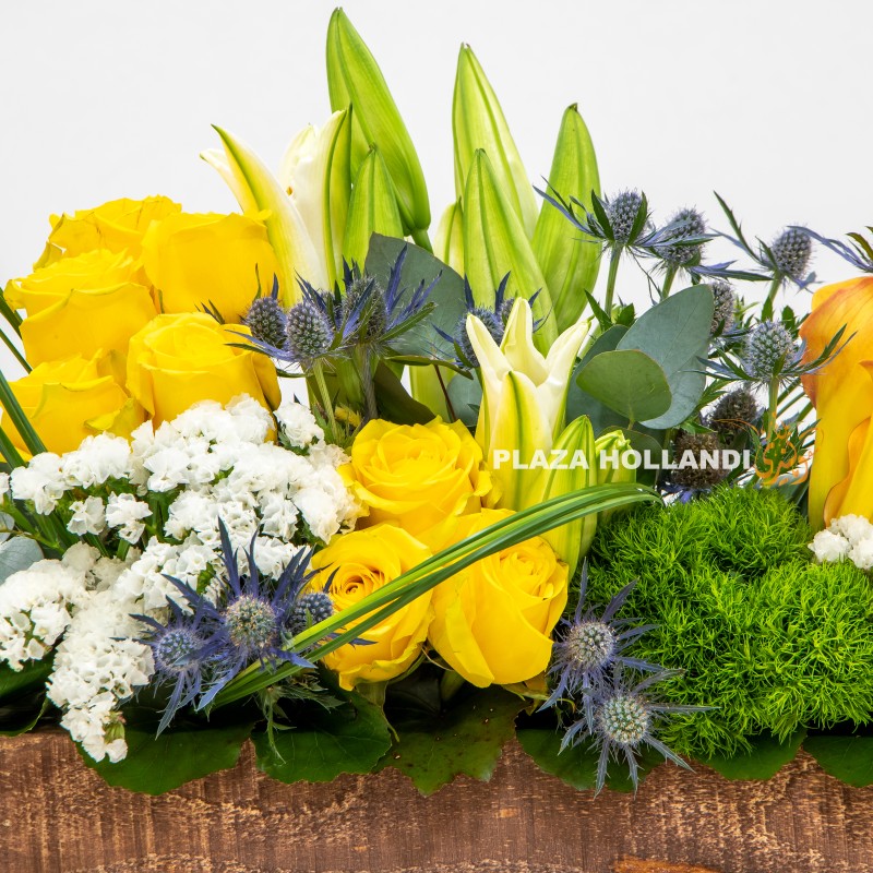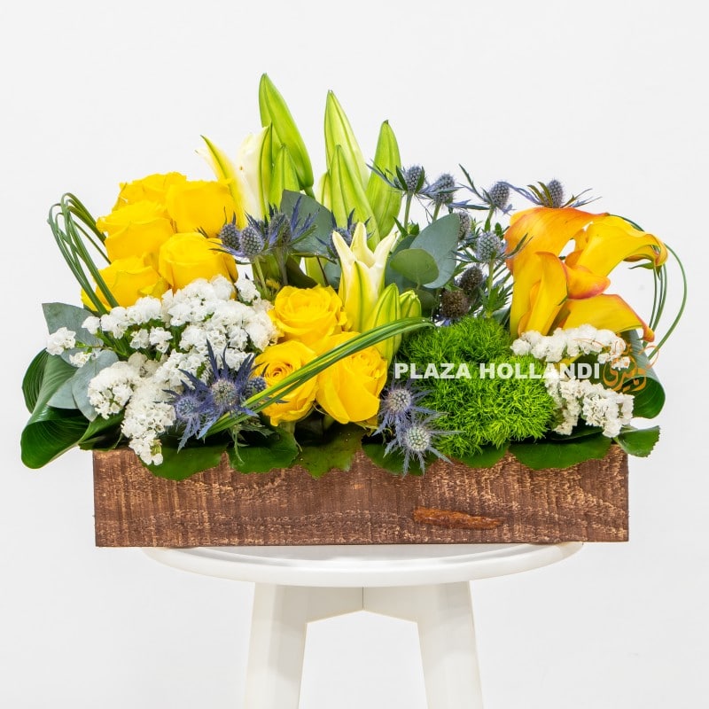A beautiful bright flower arrangement of yellow roses, calla lily, statice, lily, carnations and eryngium arranged in a handmade wooden box. This arrangement is perfect for the man in your life or to send to someone to brighten up their day. Ideal for Father’s Day. A beautiful vibrant flower arrangement for everyone to enjoy. Order before 5 pm for same-day delivery.