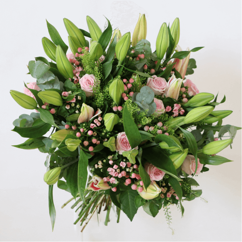 An alternative to our other lily bouquet Mary Helen, this bouquet combines white lilies, pink roses, statice and pink hypericum. Perfect for your home or for a gift.
