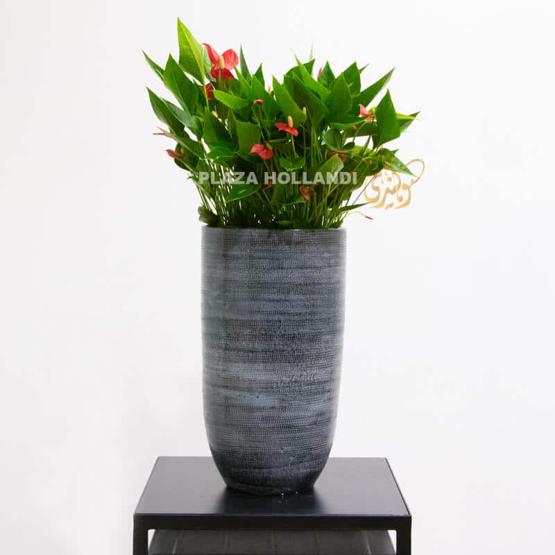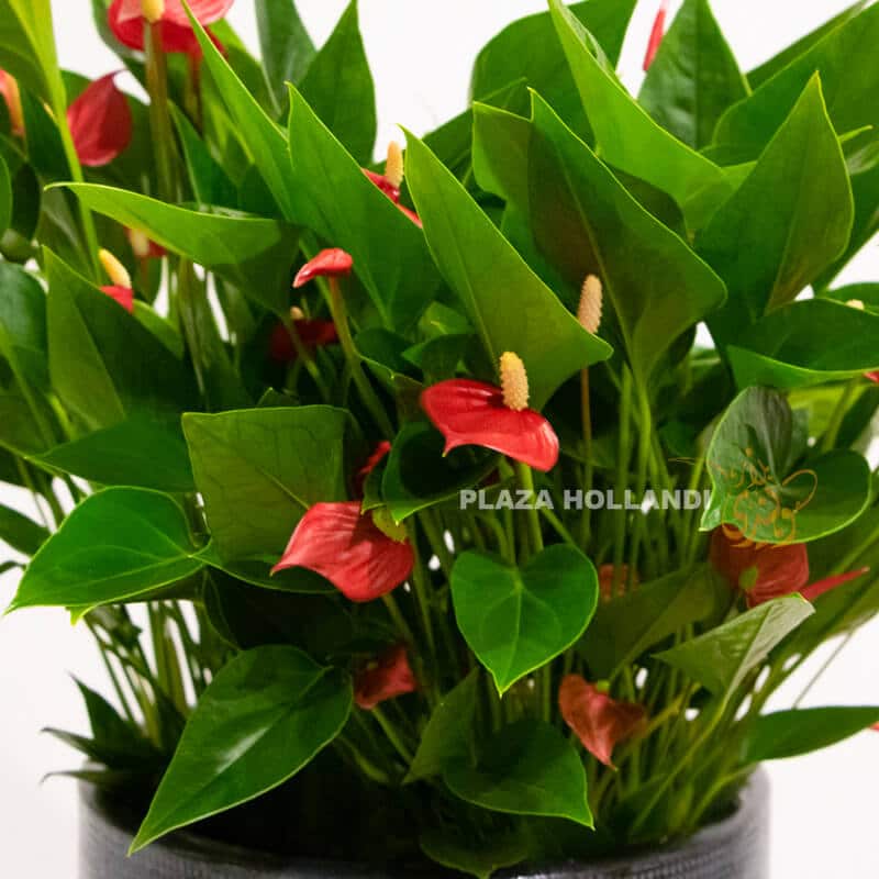 Beautiful red anthuriums plants planted in a blue grey pot. These red anthurium plants are perfect for your home, office or to send to someone for a special occasion. This pot is a perfect size to have on the floor or on a side table. Long lasting, air purifying and easy to look after, giving you plenty of joy in your indoor space.