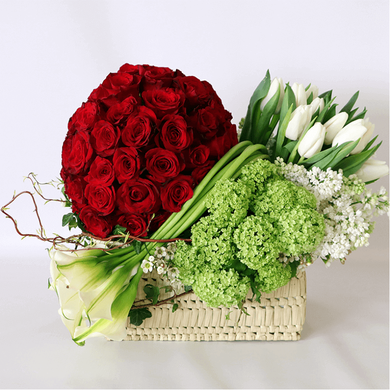 A really romantic arrangement of red roses in a sphere with white tulips, syringa, viburnum snowball and calla lily’s arranged in one of our handmade baskets.