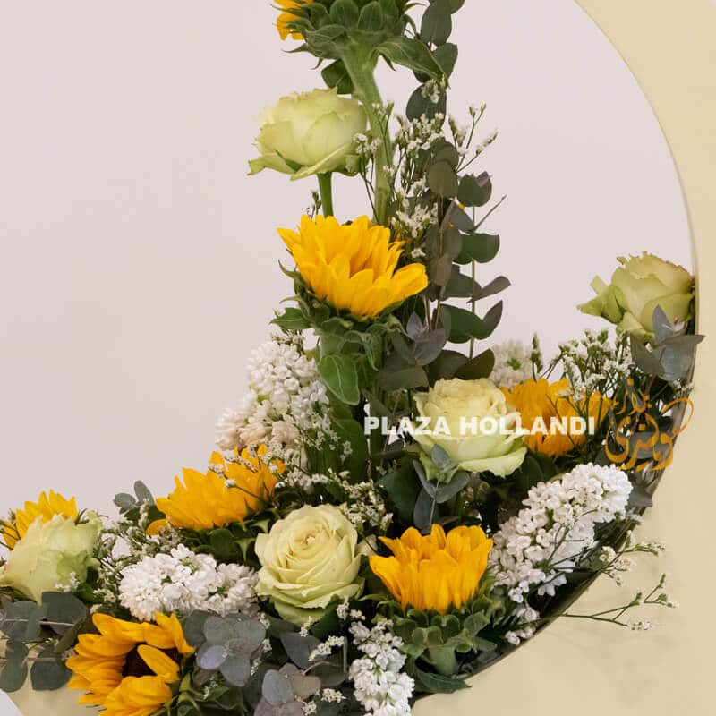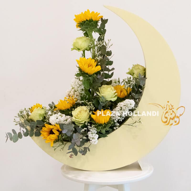 A unique crescent moon, and a perfect decoration for your home or your loved one’s home. This light yellow wooden crescent moon design has been made with sunflowers, roses, statice and eucalyptus. A beautiful design that would be perfect as a centrepiece on your table, sideboard or entrance table. Order today for delivery.