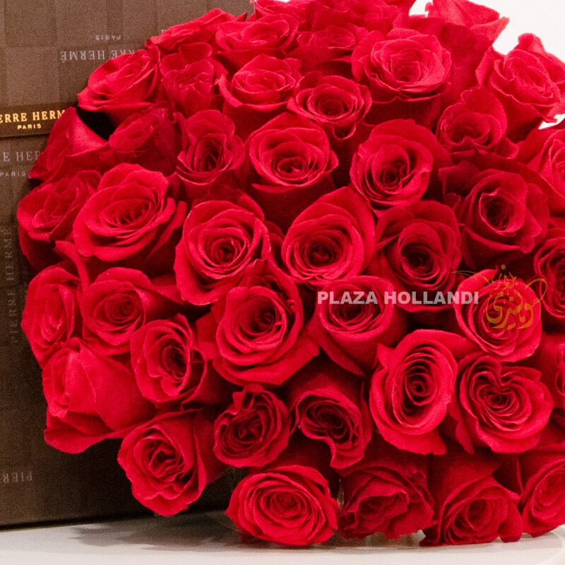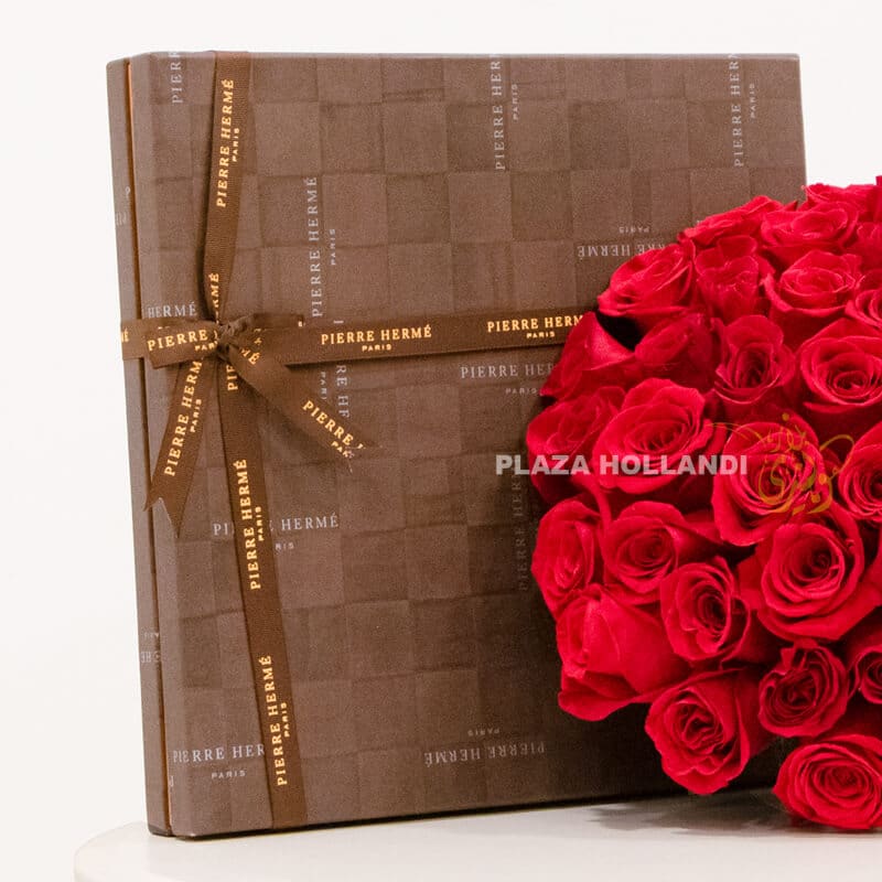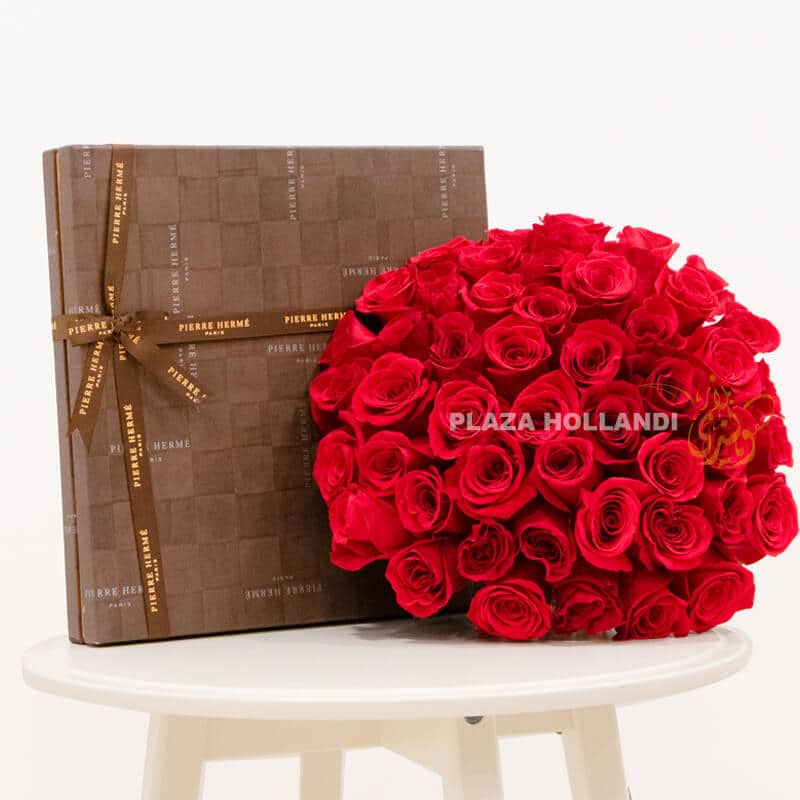 A beautiful bouquet of 50 red large headed roses, coupled together with an assortment box of mixed signature milk and dark chocolates by Pierre Hermé.