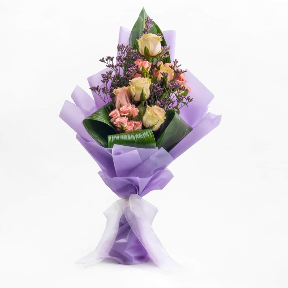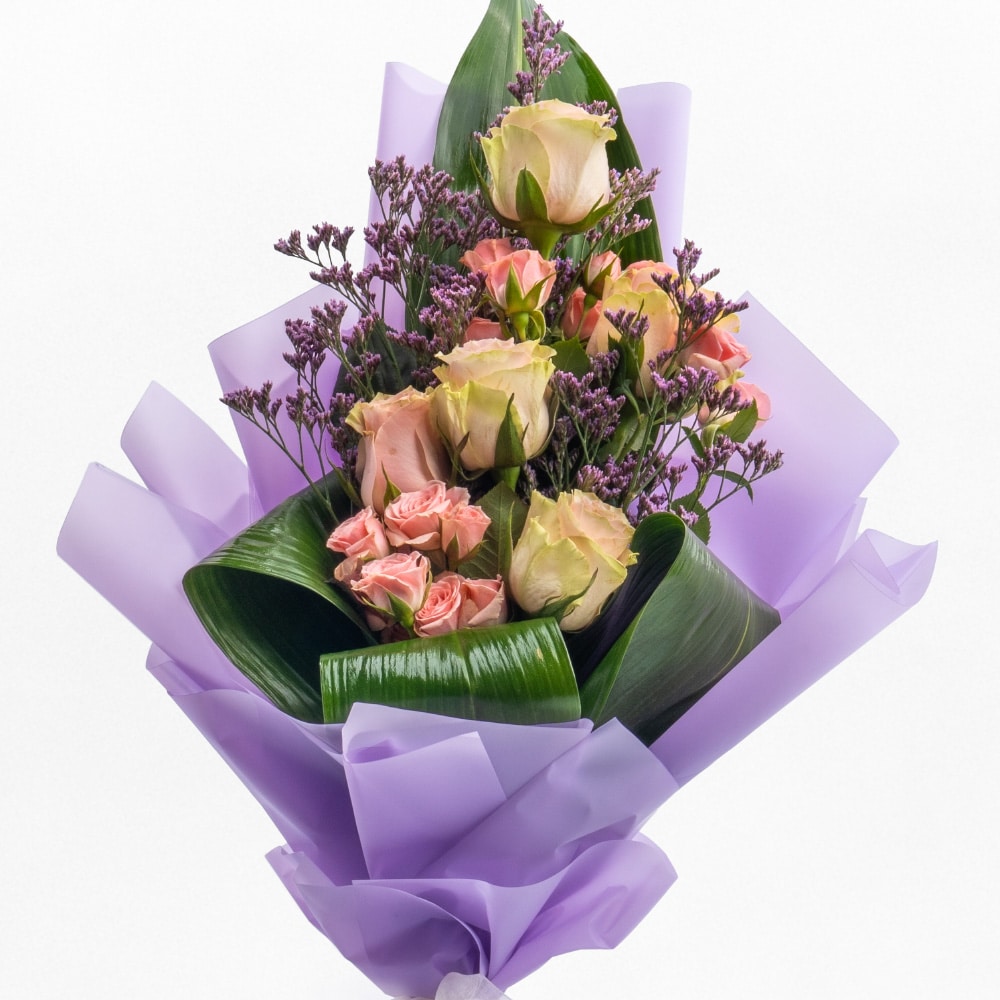 This charming arrangement features Pink Roses, Limonium, and Baby Roses, creating a delightful floral display. The Pink Roses bring a soft, romantic touch, symbolizing love and admiration. Baby Roses add a playful sweetness, enhancing the overall appeal with their petite blooms. Limonium introduces a textured element, providing contrast and a delicate backdrop. Together, these flowers form a vibrant and cheerful bouquet, perfect for celebrating special moments, brightening up any room, or expressing heartfelt sentiments.