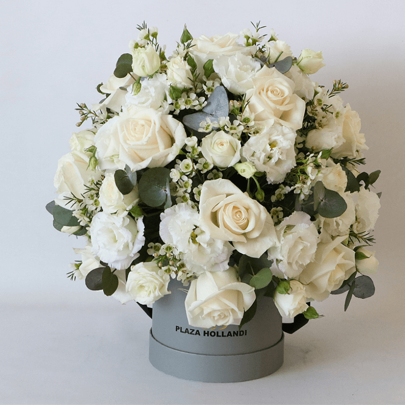 A favourite design with our customers. Our large signature hat box arranged in a loose style of white and green flowers. We have used roses, wax flower, eucalyptus and eustoma. A beautiful arrangement that would work with any interior. A great gift to receive. Order now for delivery.