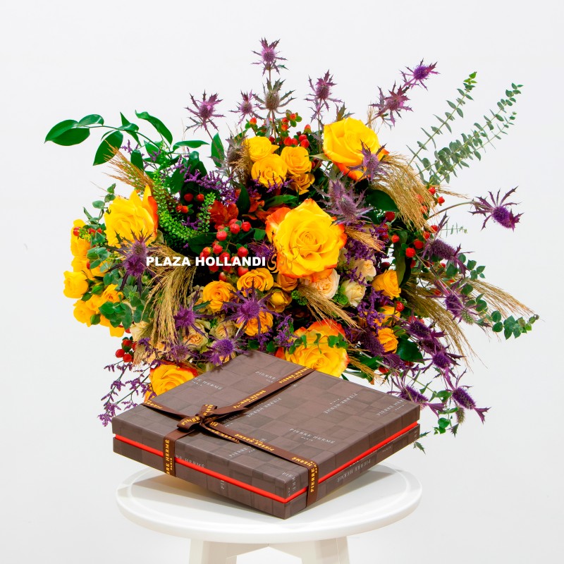 A beautiful bright loose European style bouquet of yellow roses, wax flower, limonium, dried flowers, eustoma, eryngium with eucalyptus, coupled together with a medium assortment box of signature milk and dark chocolates by Pierre Hermé.