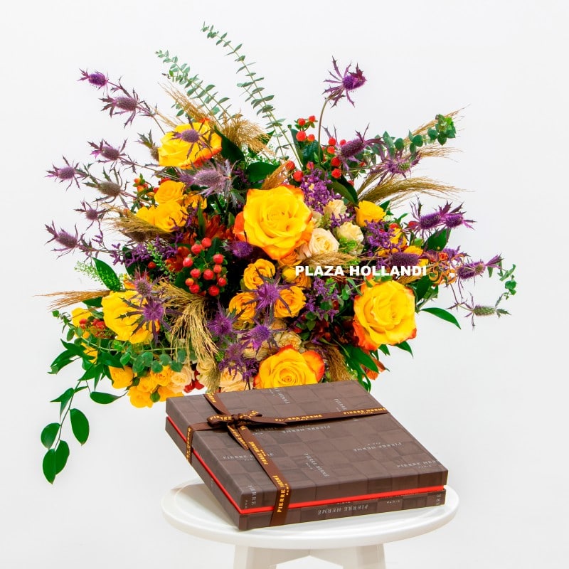 This combined gift of fresh flowers together with delicious sweet treats from Pierre Hermé are only available online at Plaza Hollandi. Voted ‘Best Pastry Chef in the World’ in 2016 and nominated the 4th most influential French personality in the world in the same year by Vanity Fair magazine, Pierre Hermé creates his own tastes and flavour combinations, just like an artist. A gift that will be remembered as a thoughtful idea to give as well as to receive. A beautiful flower and chocolate combination.