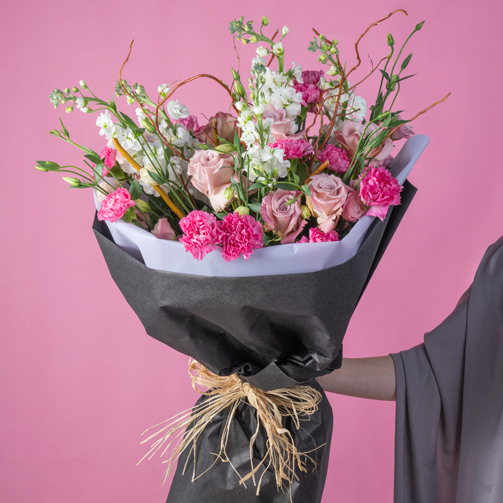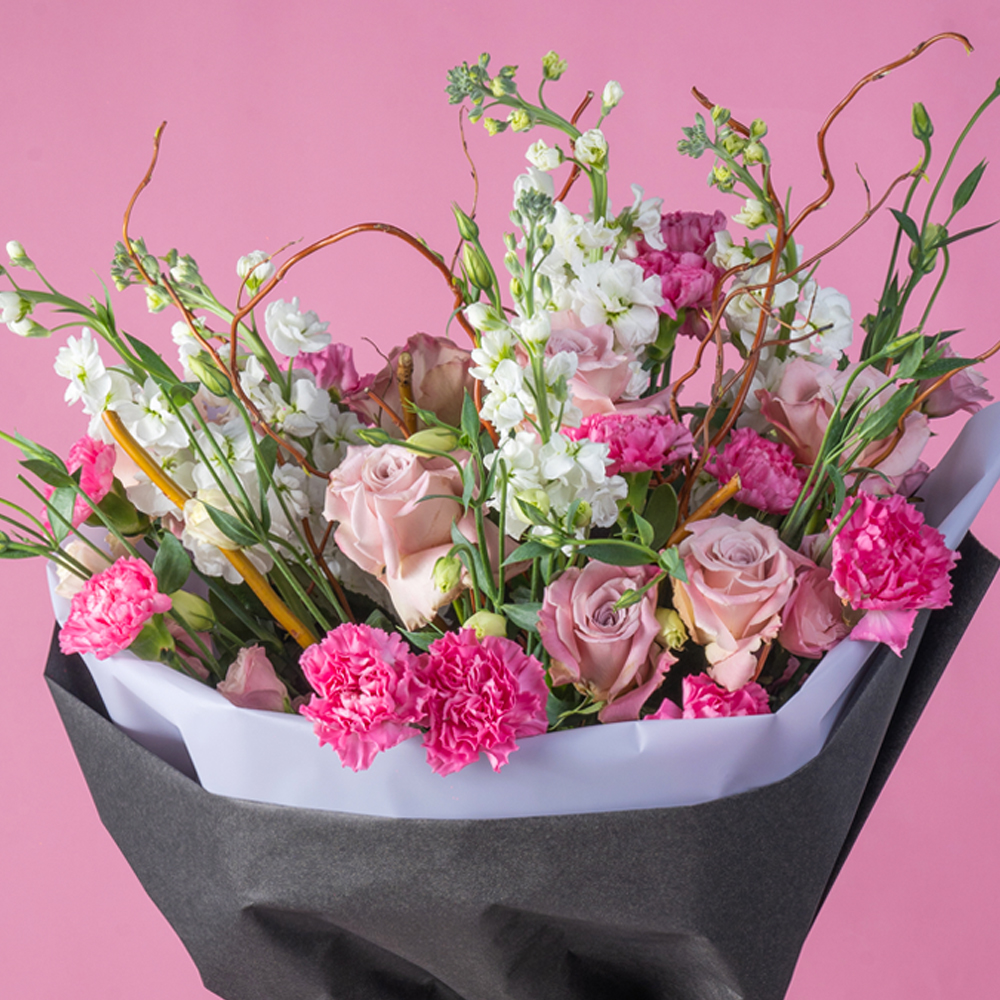 In this captivating bouquet, Eustoma, Roses, Matthiola, and Carnations come together to create a stunning display of color, texture, and fragrance. The delicate blooms of Eustoma, also known as Lisianthus, add a touch of softness and elegance to the arrangement, with their ruffled petals and subtle hues. Roses, with their timeless beauty and romantic allure, serve as the focal point, exuding love and sophistication. Matthiola, or Stock, contributes fragrant clusters of blooms that bring vertical interest and visual intrigue to the bouquet. Finally, Carnations offer a pop of color and durability, adding vibrancy and charm. Each flower is meticulously arranged to create a harmonious composition that captivates the senses and uplifts the spirit. Whether adorning a wedding celebration, gracing a dining table, or serving as a heartfelt gift, this bouquet is sure to leave a lasting impression with its beauty and elegance.