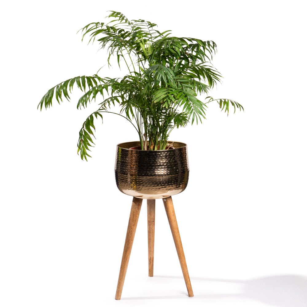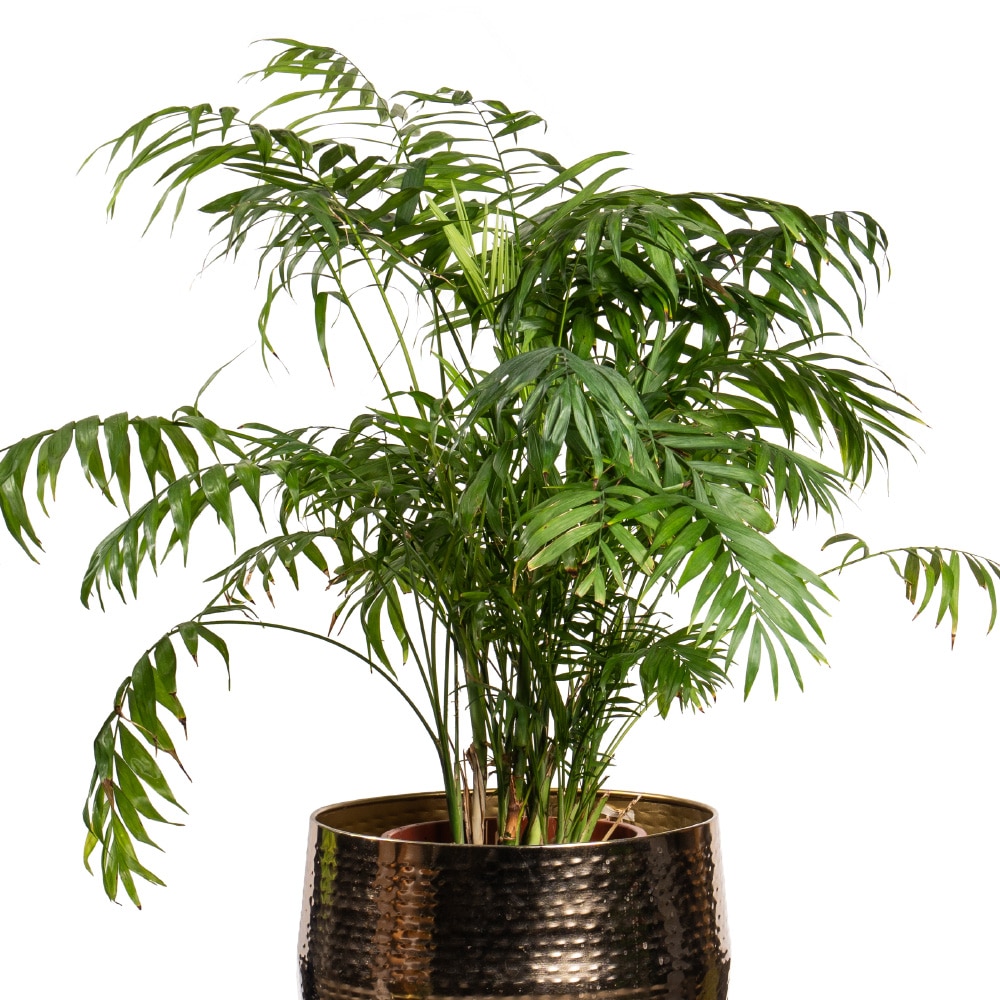 The Chamaedorea elegans, also known as the Parlor Palm, stands at an impressive 165 cm and is beautifully presented in a stylish brass pot. This elegant palm features feathery, arching fronds that add a touch of tropical charm to any interior. The brass pot enhances the overall aesthetic with a modern and luxurious flair, making it a perfect statement piece for homes or offices. This combination not only elevates your decor but also creates a serene and inviting atmosphere.