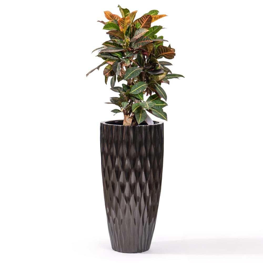 The Croton, standing at 130 cm, is displayed in a beautifully designed pot, making a bold and colorful statement. Known for its strikingly vibrant foliage with hues of red, yellow, and green, the Croton adds a lively and dynamic element to any space. Paired with a stylish pot, this plant brings both natural beauty and modern design to homes or offices, creating an eye-catching focal point and enhancing the ambiance with its tropical charm.