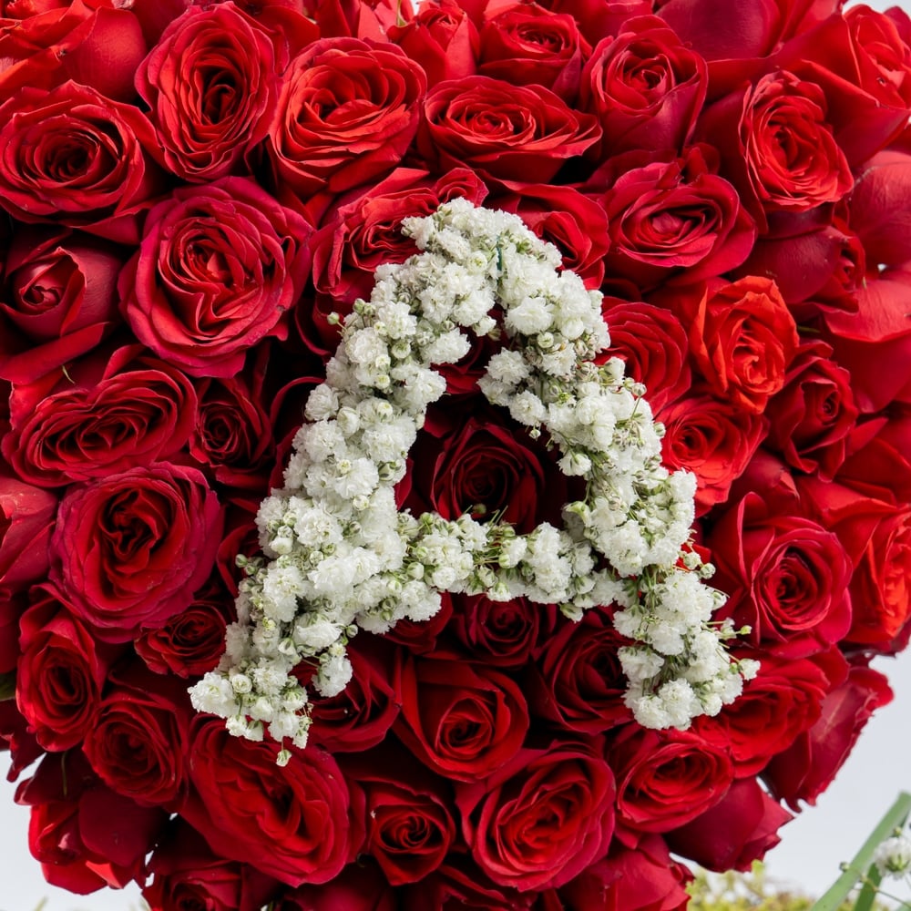 This arrangement features Red Roses with Gypsophila (Baby’s Breath), set on a base of moss and steel grass. The vibrant red roses and delicate Gypsophila are complemented by the lush moss and textured steel grass. A customizable letter can be added to personalize the arrangement, making it a thoughtful and unique gift for any occasion.