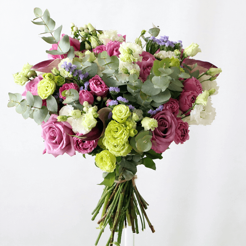 A beautiful bouquet in one of our most popular colour combinations, pink, purple, white, with a touch of green. Made using roses, calla lily, hypericum, spray rose, eustoma, statice and mixed greenery. Order now for free delivery.