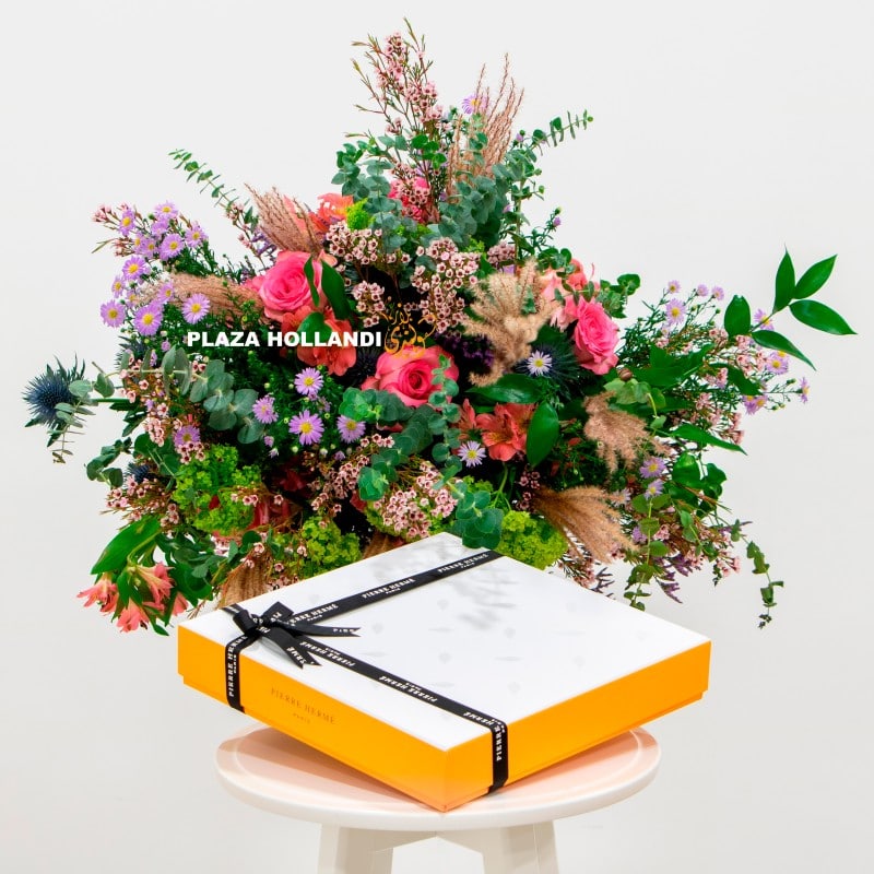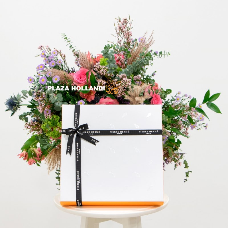 This combined gift of fresh flowers together with delicious sweet treats from Pierre Hermé are only available online at Plaza Hollandi. Voted ‘Best Pastry Chef in the World’ in 2016 and nominated the 4th most influential French personality in the world in the same year by Vanity Fair magazine, Pierre Hermé creates his own tastes and flavour combinations, just like an artist. A gift that will be remembered as a thoughtful idea to give as well as to receive. A beautiful flower and chocolate combination.