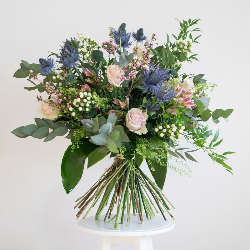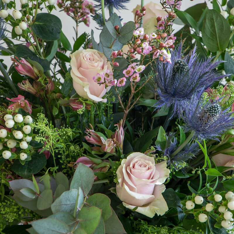 An absolutely stunning loose European style bouquet. This favourite with our customers in now available on our webshop for delivery. Filled with roses, eryngium, wax flower, hypericum, ruscus, eucalyptus and alstroemeria this long lasting large bouquet is a perfect bouquet to send to your loved ones or to display in your home.