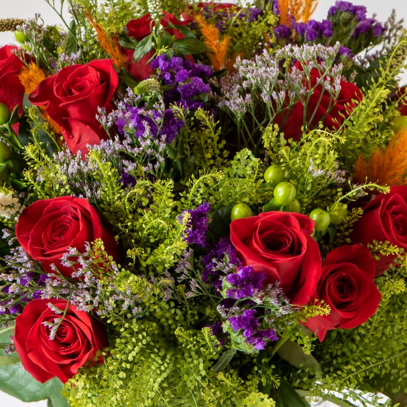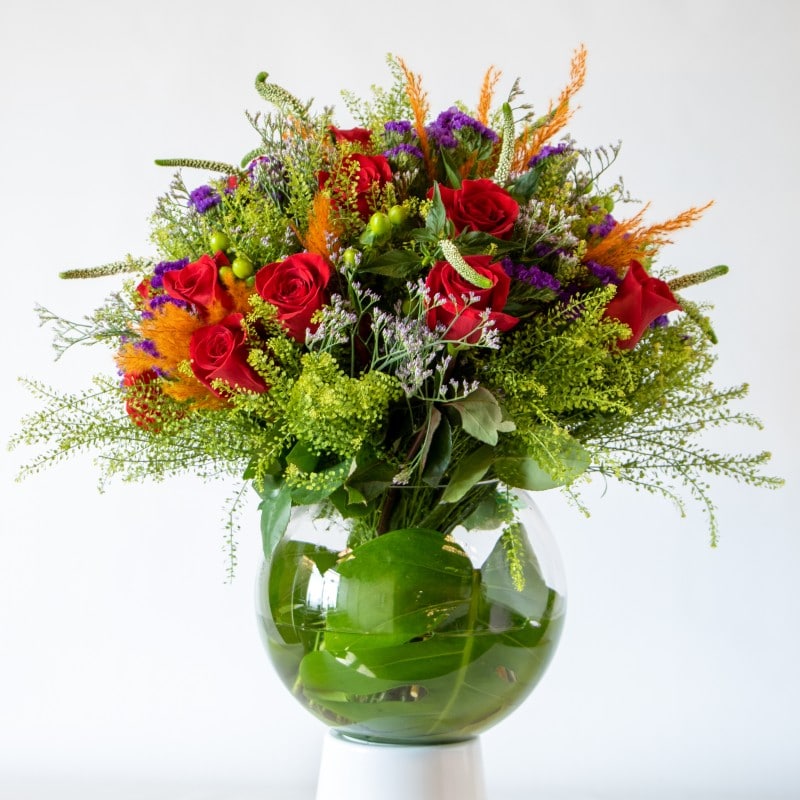 A stunning natural designed bouquet with red roses, pampas grass, purple statice, mixed foliage, hypericum and limonium delicately tied together and placed in a glass vase with water. This design would look perfect on your table or would be a great arrangement to send to your loved ones.  If you have a gift to add to the design just let us know and we can arrange it for you.