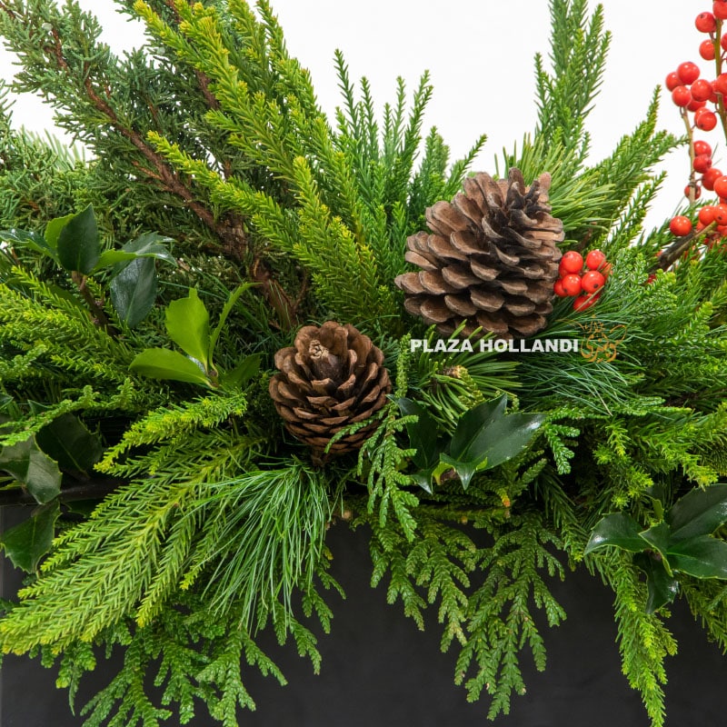 This festive arrangement designed in a wooded black box it is full of seasonal foliage, pinecones, berries, and greenery.