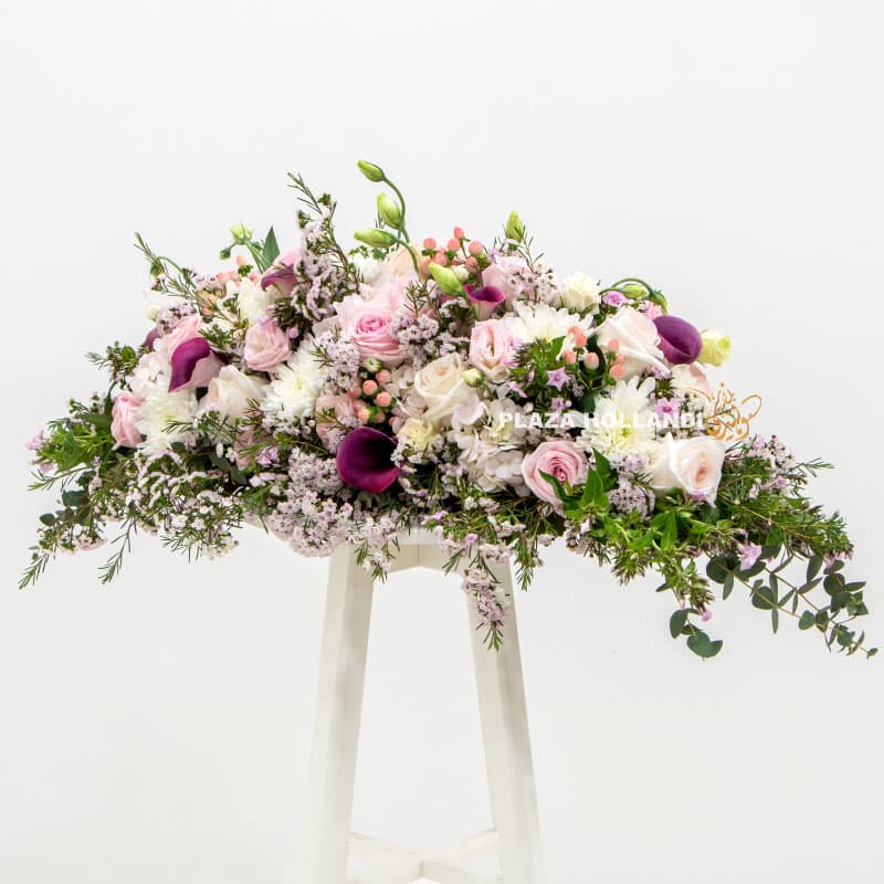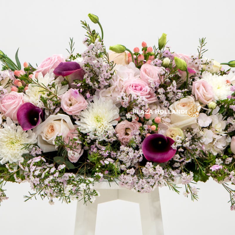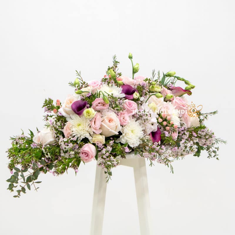 A beautiful long and low table floral table decoration. Perfect as a decoration for your table for Iftar, Sohour or a special dinner occasion. This floral design is ideal to add to your table and add your delicious food and sweets around it. Approximately 1mtr in length, this design uses fresh seasonal flowers, such as roses, carnations, chrysanthemums, wax flower, calla lilies and a mixture of foliage.