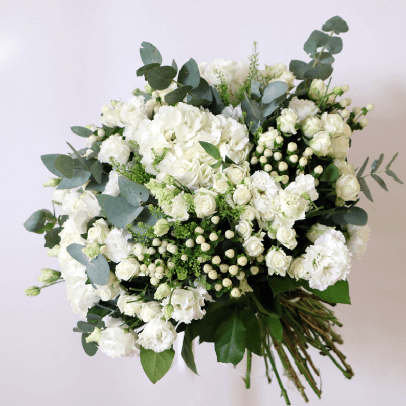 A classic colour combination of white and green flowers. This bouquet is made using hydrangea, spray rose, hypericum, roses, eustoma and mixed greenery. An elegant addition to any room in your home.