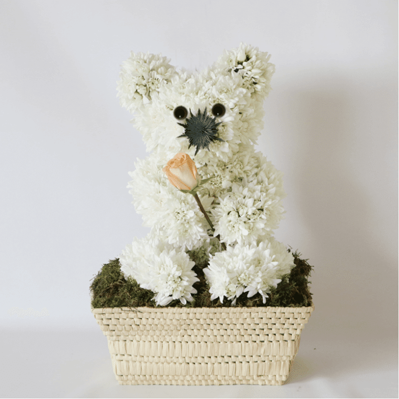 Welcome to the world! A gorgeous teddy bear made from white chrysanthemums sitting on a bed of moss. A perfect gift to give to some one to welcome a new baby into the world.