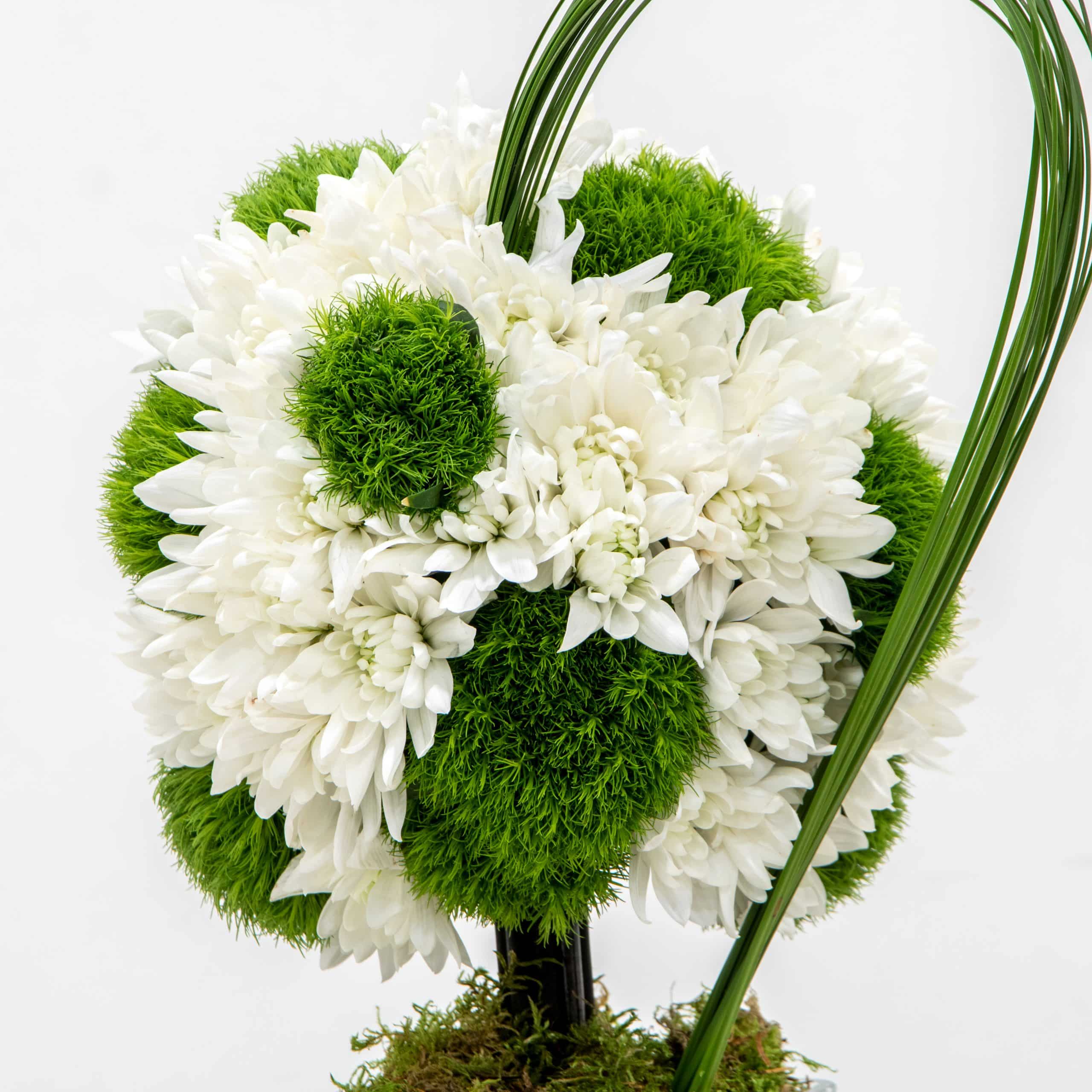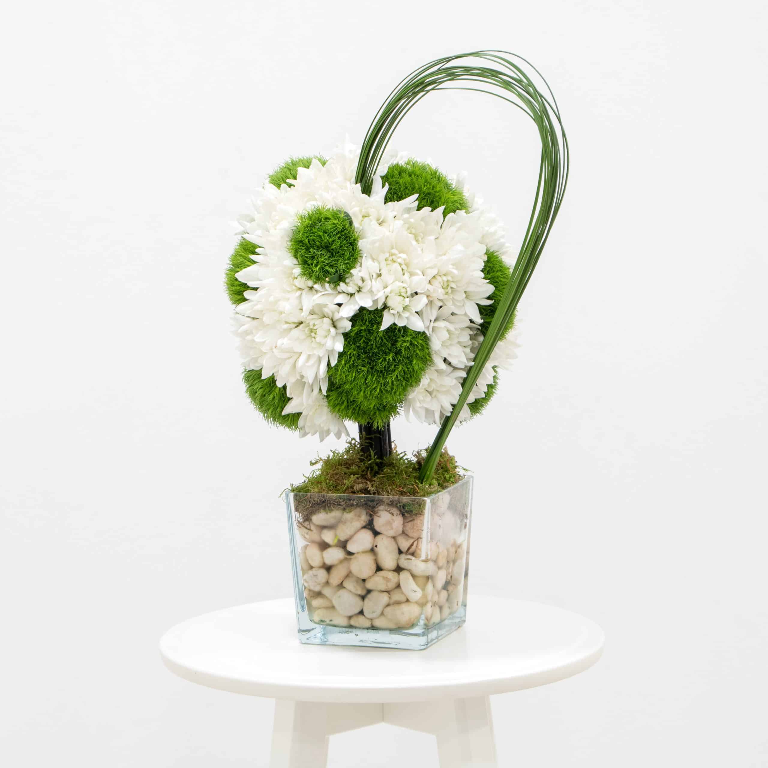 A unique design of green and white flowers designed as a football on stick in a vase full of moss and stones.