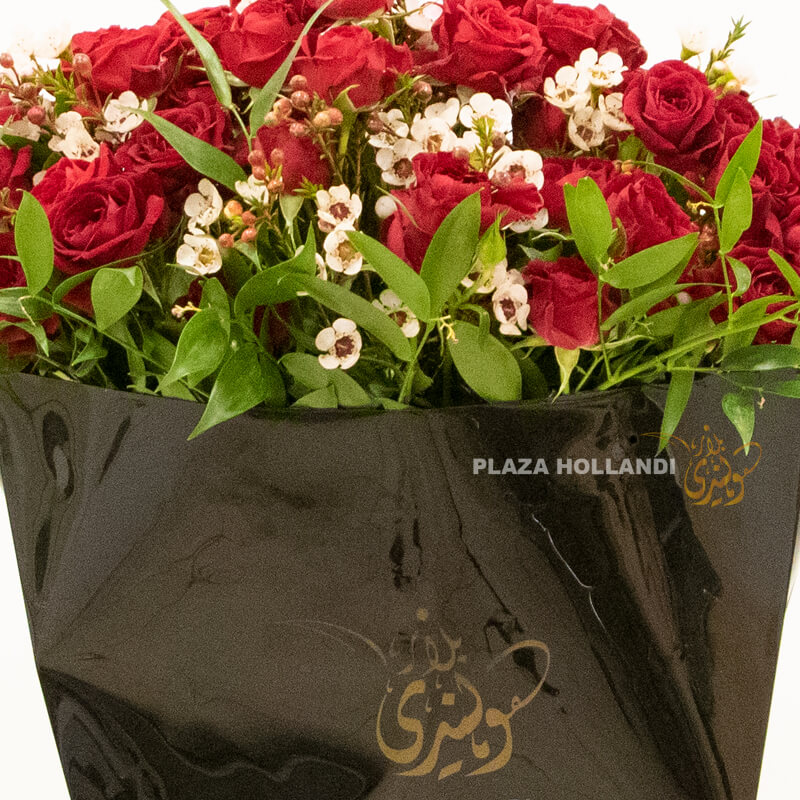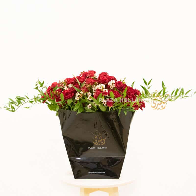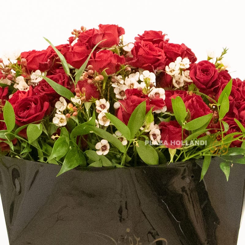 A beautiful delicate romantic bouquet of red spray roses and white wax flowers with a touch of mixed foliage. This bouquet comes presented in a beautiful luxurious black Plaza Hollandi Gift bag. A beautiful gift to send to your loved ones this Valentine’s Day, or as an anniversary gift.