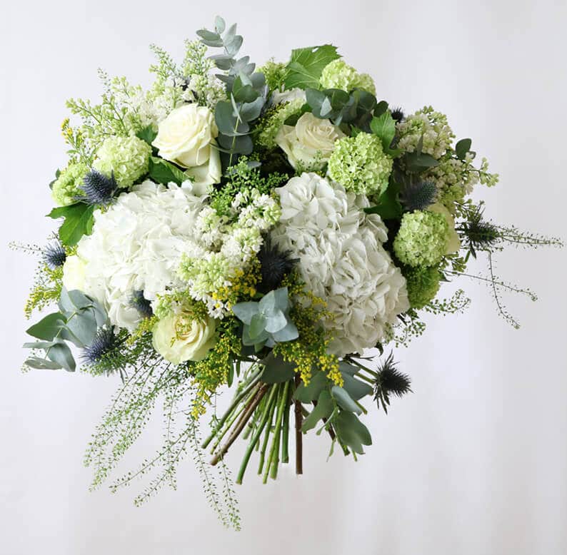 A fresh and clean bouquet of white hydrangea, white rose, white spray rose, eustoma and mixed greenery. This beautiful white and green bouquet would suit any part of your home and match all interiors.