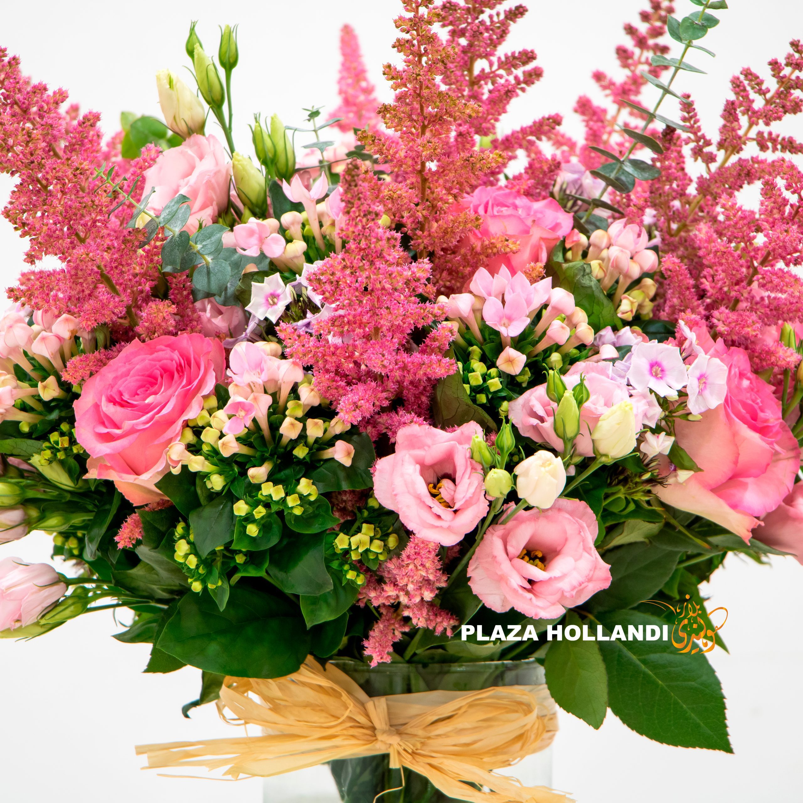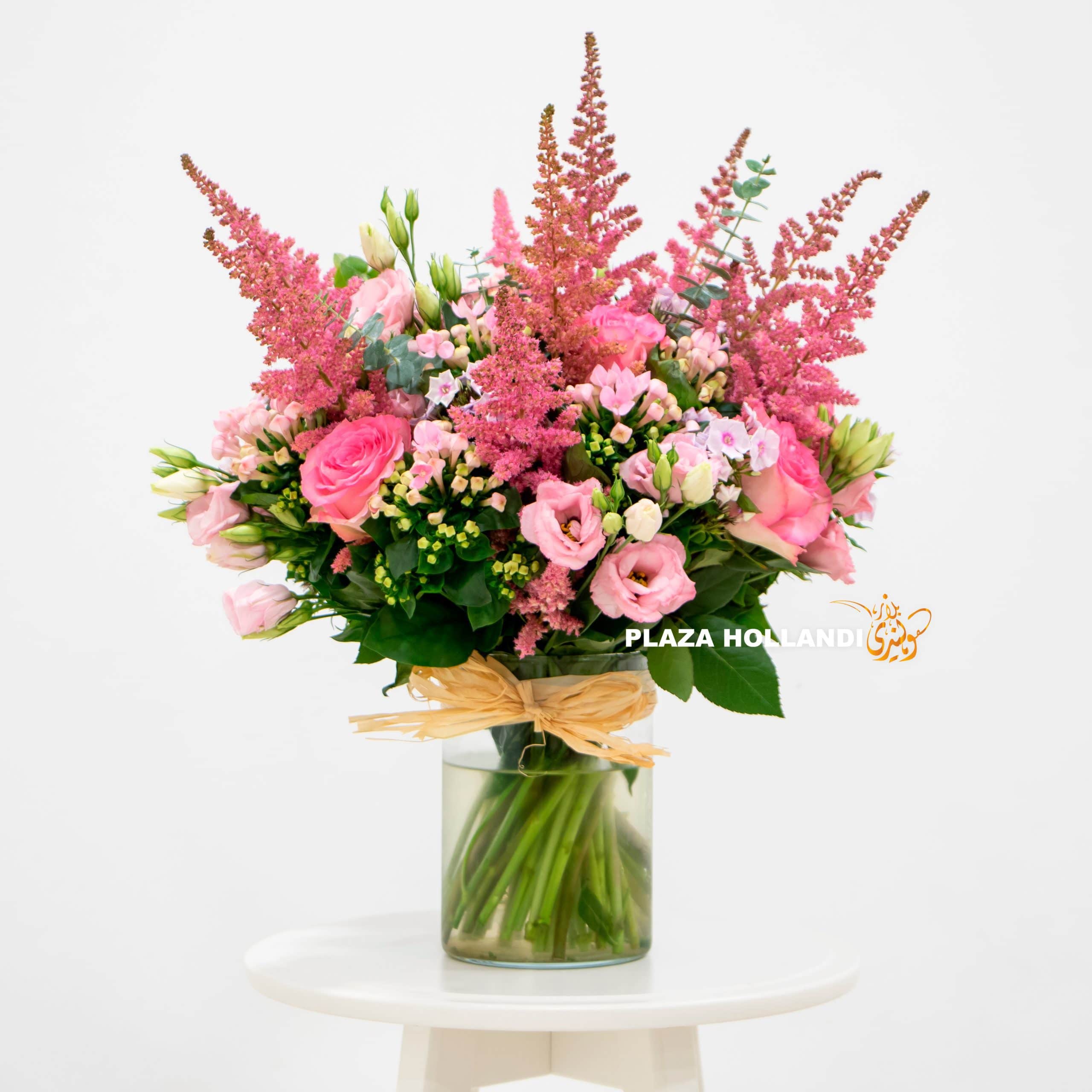 This gorgeous bouquet full of pink mixed flowers has been beautifully arranged in a glass vase. A popular classic design including pink roses, pink astilbe, pink bouvardia, pink eustoma, and natural grass. Order today for delivery.
