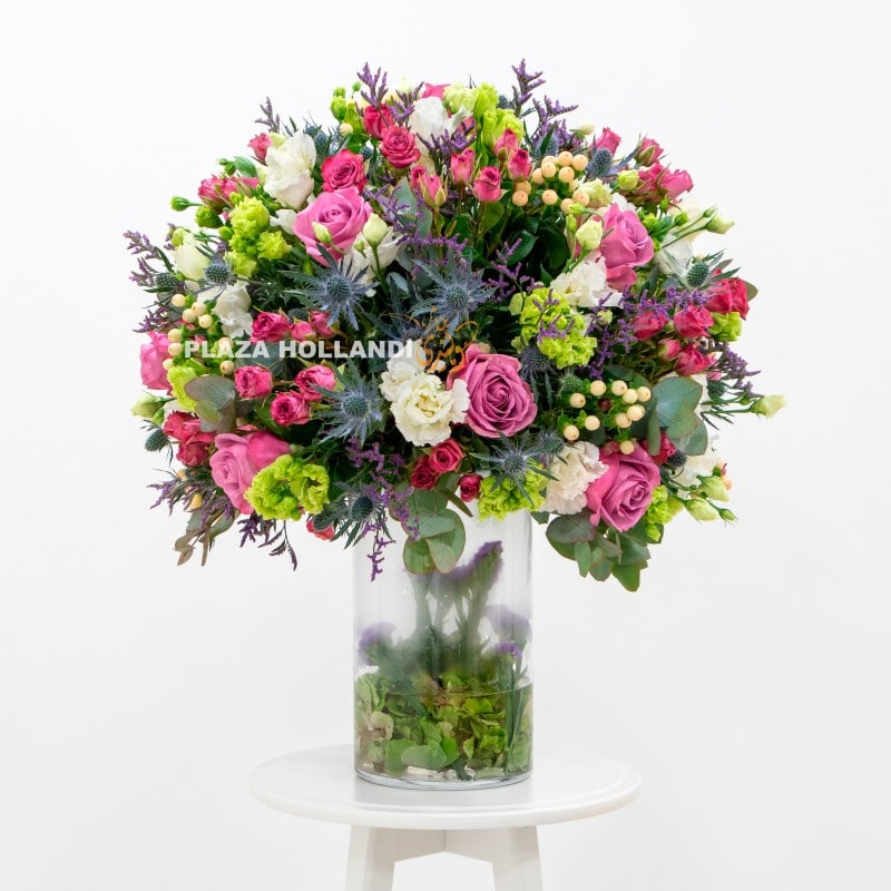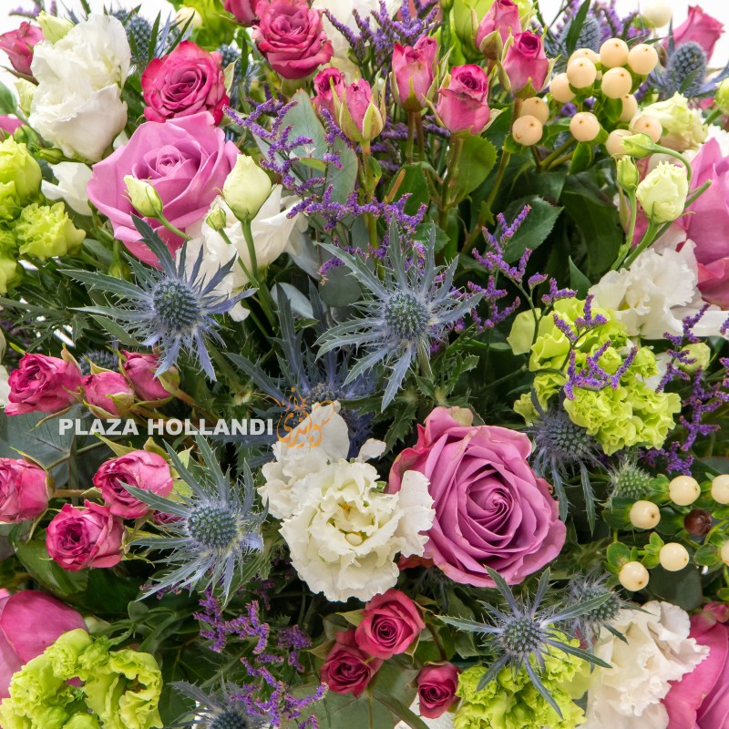 Dazzle your recipient with Plaza Hollandi’s stunning purple rose flower arrangements! Crafted with a delightful mix of vibrant purple roses, delicate green and white eustoma, charming eryngium, playful spray roses, and eye-catching hypericum, this arrangement boasts beauty and elegance guaranteed to impress.