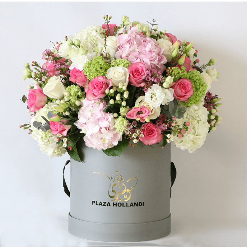 A beautiful flower arrangement of pink and white flowers in Plaza Hollandi hat box design.