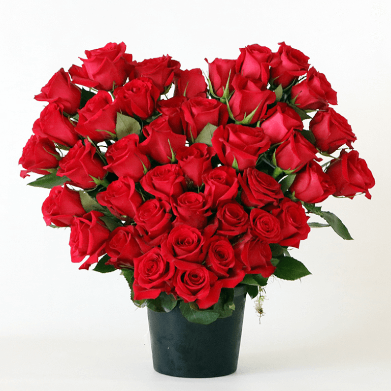 Large headed red roses arranged into a heart shaped flower arrangement in a black pot.