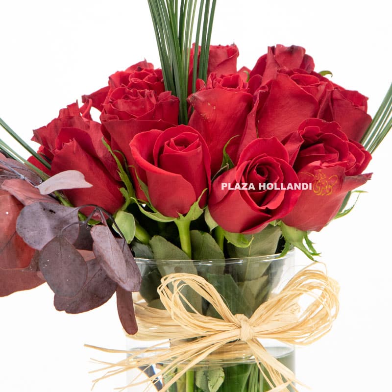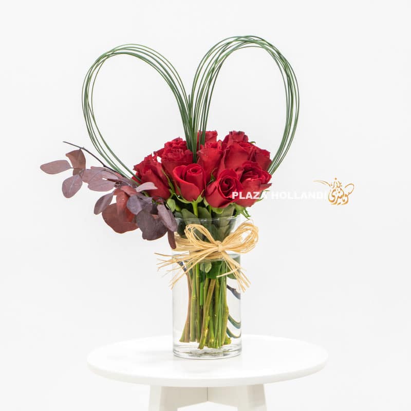 A romantic arrangement of red roses arranged in a flower bouquet in a glass vase with a heart shaped from steel grass. A beautiful bouquet especially designed for Valentine’s Day. Order your flower arrangement today for same-day delivery.