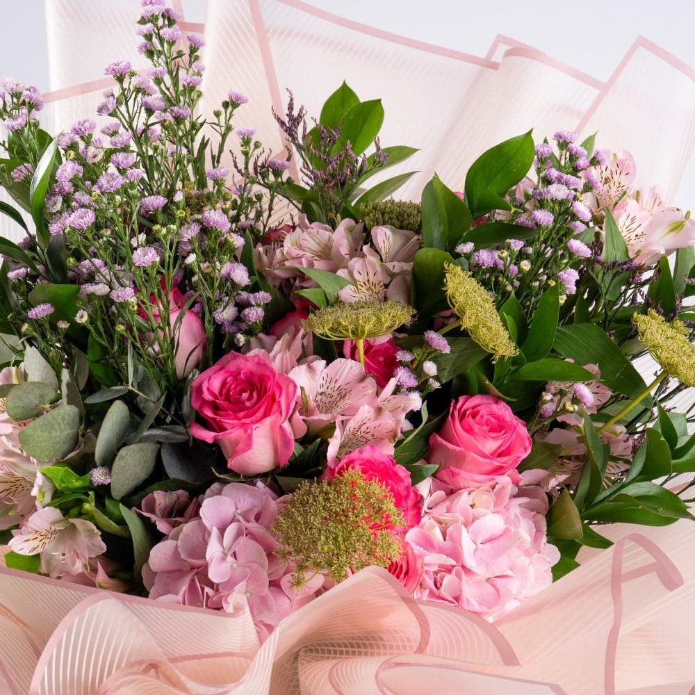 This stunning arrangement features Hydrangea, Aster, Roses, Alstroemeria, Ammi, Ruscus, and Eucalyptus. The lush Hydrangea and Roses add elegance and volume, while Aster and Alstroemeria provide vibrant accents of color. Ammi introduces a delicate, airy texture, complemented by the fresh greenery of Ruscus and Eucalyptus. Together, these elements create a harmonious and eye-catching display, perfect for any special occasion or to bring natural beauty into your space.