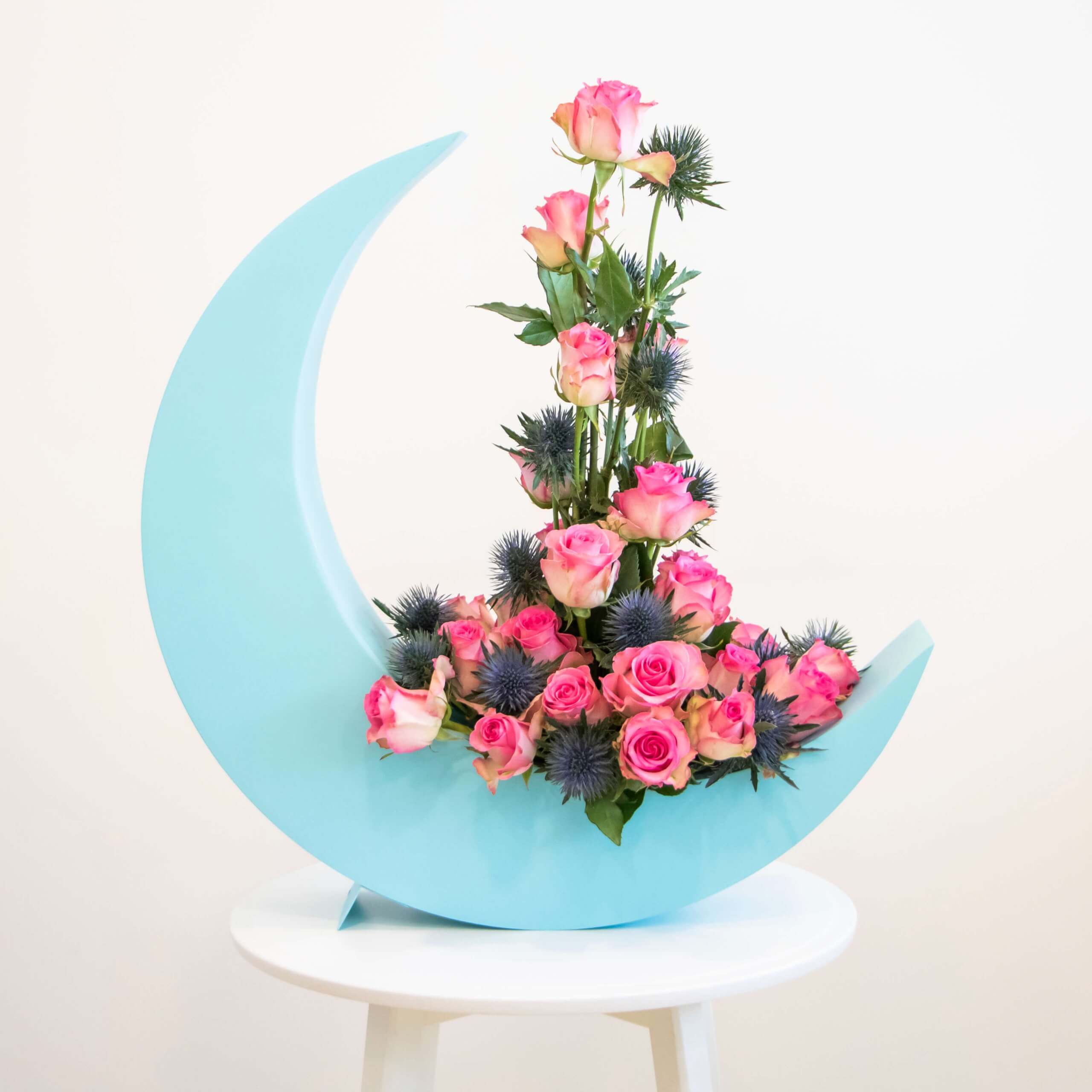 Our crescent moon design is the perfect decoration for your home or your loved one’s home. This blue crescent moon has been designed with pink roses and eryngium and a mixture of foliage. It would look perfect as a centre piece on your table this Ramadan or Eid. Pre-Order now available.