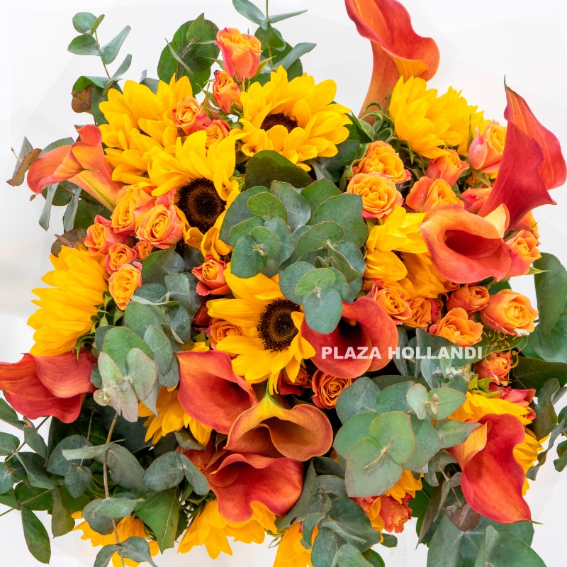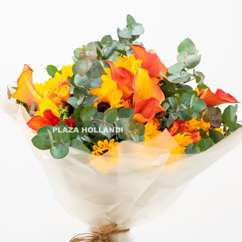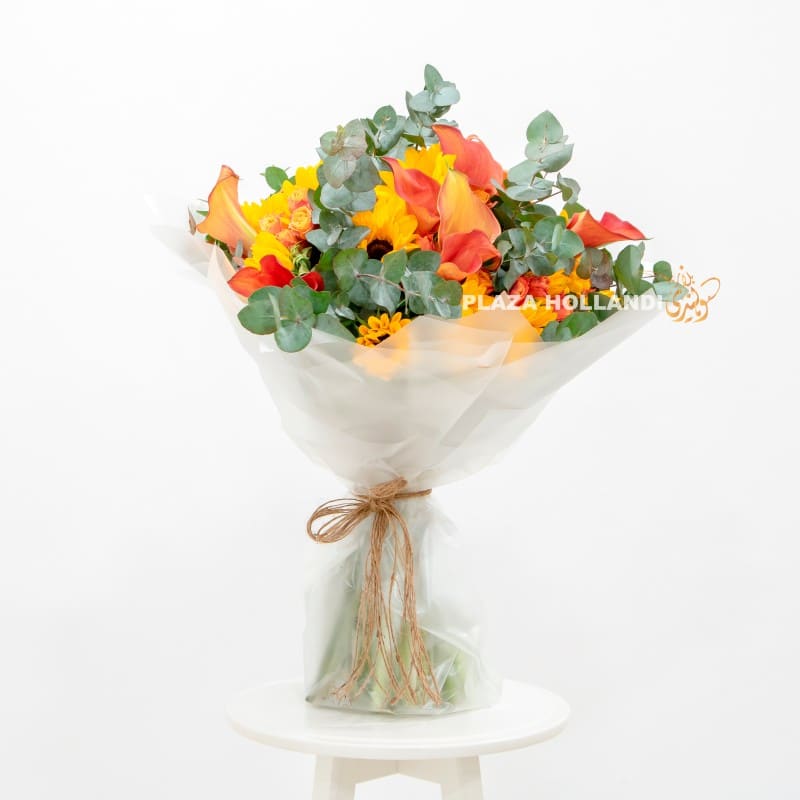 A beautiful bouquet of yellow & orange flowers. Sunflower, calla lily, baby roses and eucalyptus, wrapped in transparent paper. A beautiful bouquet to send to your loved ones, friends, and family members. Order before 5 pm for same-day delivery anywhere in Qatar.