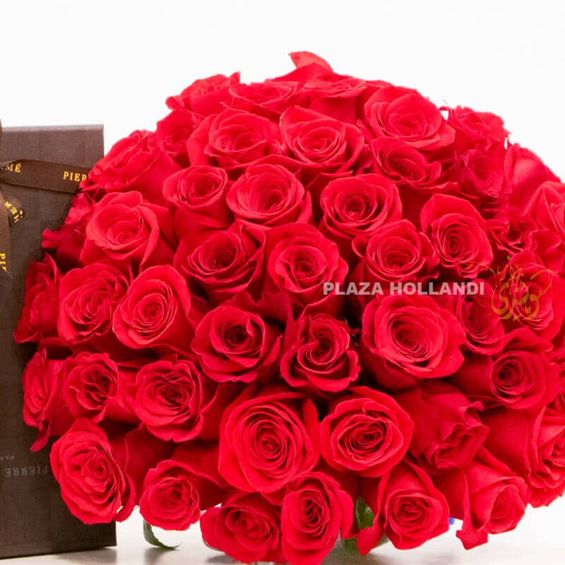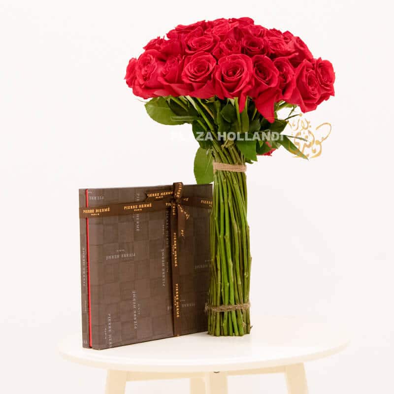 A beautiful bouquet of 50 red large headed roses, coupled together with an assortment box of mixed signature milk and dark chocolates by Pierre Hermé.