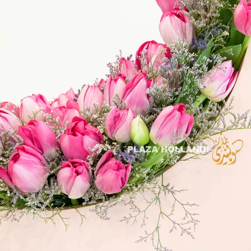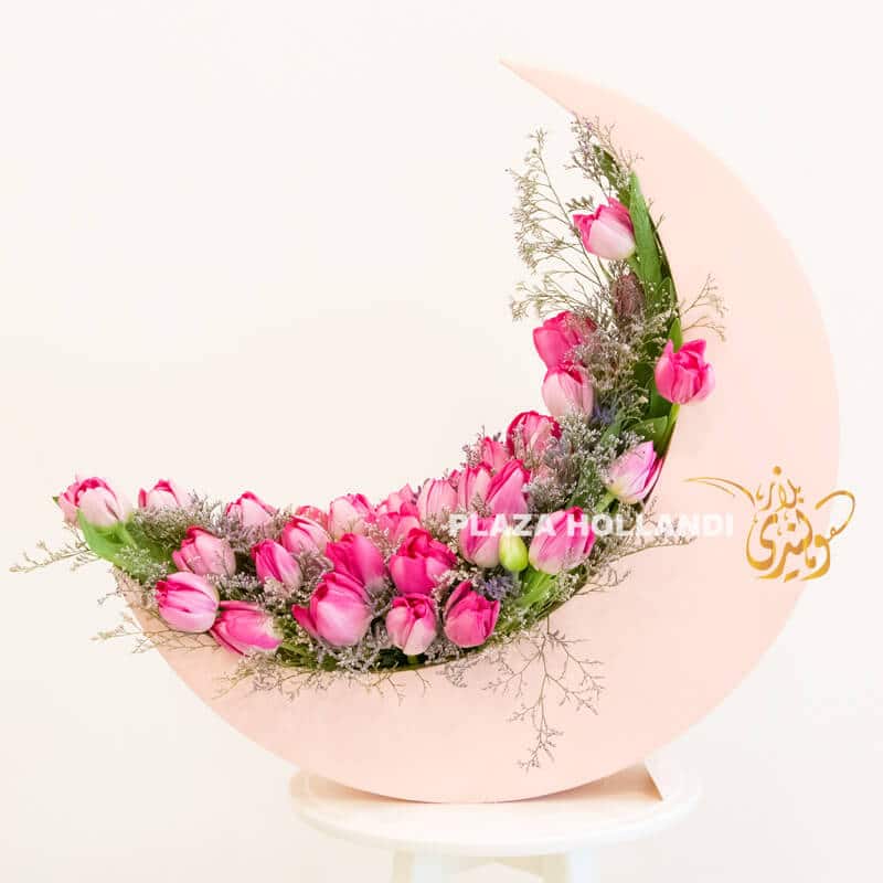 A beautiful pink crescent moon flower design. Perfect to use to decorate your home or to send to a loved one over Ramadan and Eid. This light pink wooden crescent moon design has been made with pink tulips and a touch of purple Limonium. A beautiful design would look perfect as a centrepiece on your table, sideboard or entrance table. Order today for delivery.