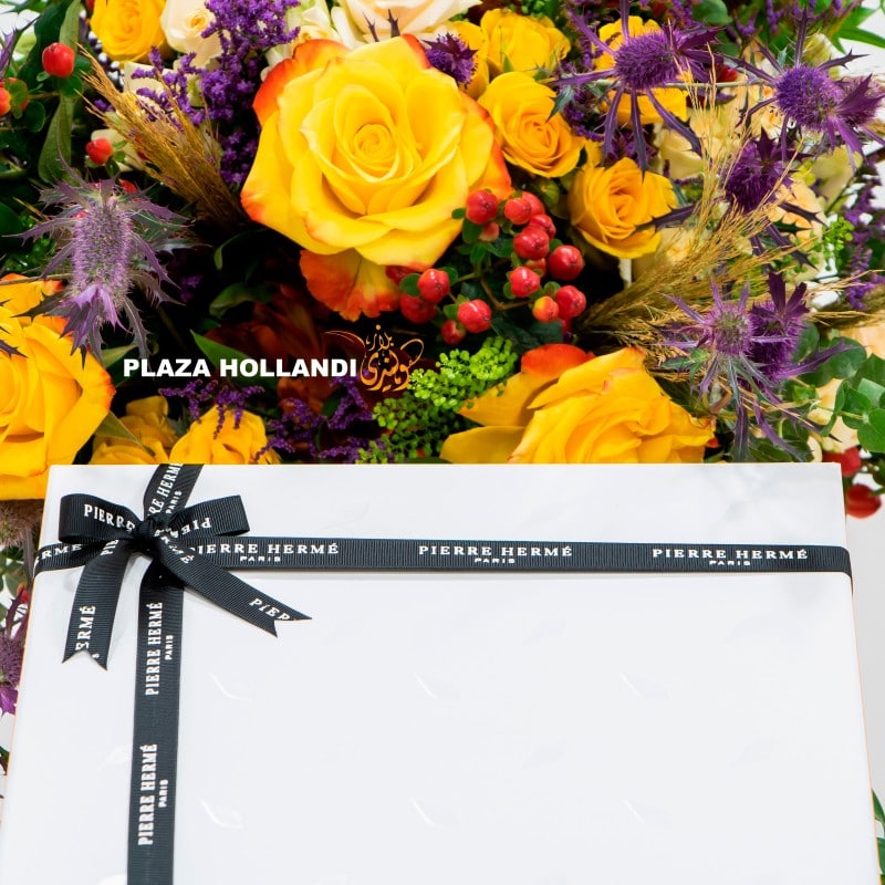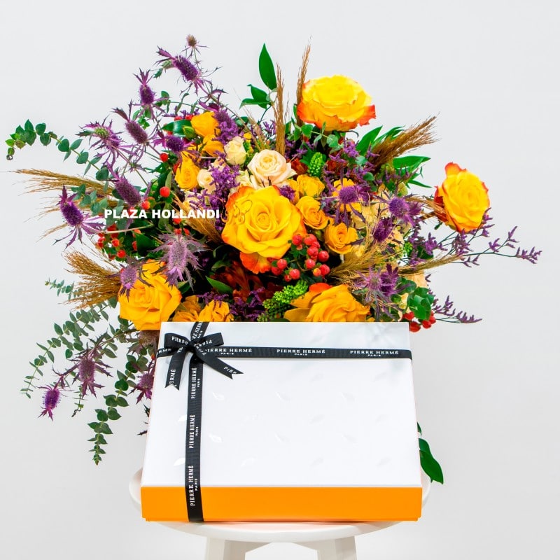 This combined gift of fresh flowers together with delicious sweet treats from Pierre Hermé are only available online at Plaza Hollandi. Voted ‘Best Pastry Chef in the World’ in 2016 and nominated the 4th most influential French personality in the world in the same year by Vanity Fair magazine, Pierre Hermé creates his own tastes and flavour combinations, just like an artist. A gift that will be remembered as a thoughtful idea to give as well as to receive. A beautiful flower and chocolate combination.