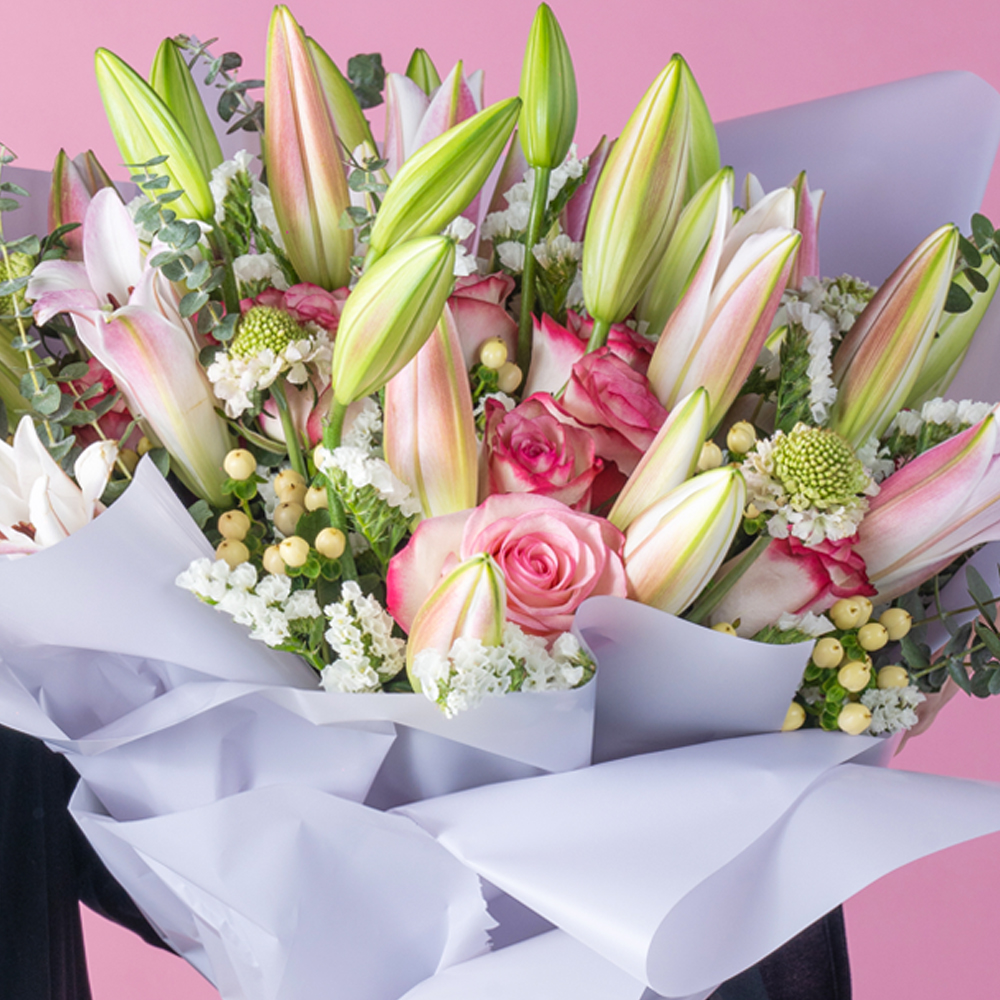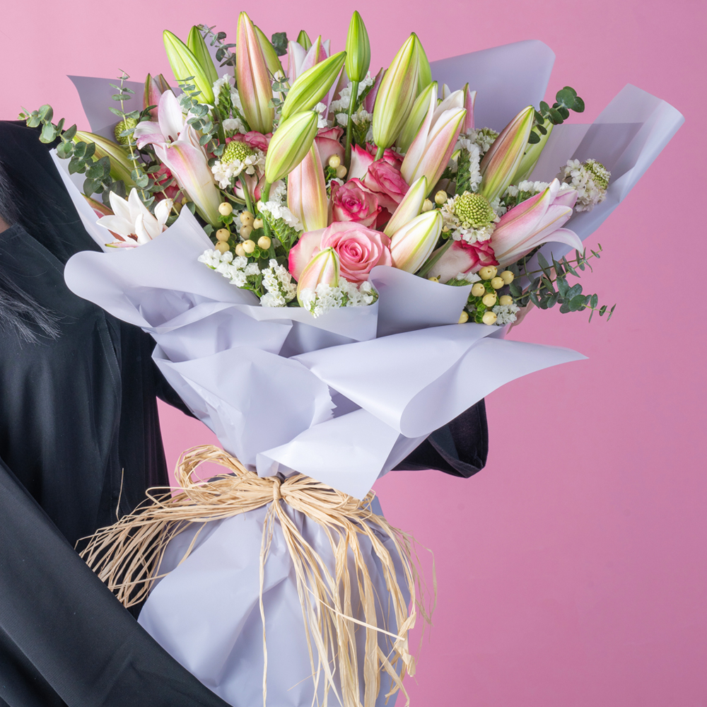 In this enchanting Lily bouquet, Lilies stand tall as the focal point, exuding purity and grace, complemented by delicate clusters of Statice adding texture and whimsy. Fragrant Roses intertwine with the refreshing aroma of Eucalyptus, while glossy Hypericum berries and delicate Scabiosa blooms add pops of color and charm. This arrangement captivates with its harmonious blend of elegance, fragrance, and natural beauty, perfect for weddings, special occasions, or as a heartfelt gift to convey admiration and affection.