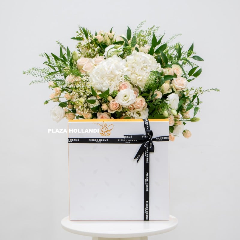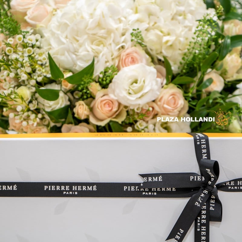 This combined gift of fresh flowers together with delicious sweet treats from Pierre Hermé are only available online at Plaza Hollandi. Voted ‘Best Pastry Chef in the World’ in 2016 and nominated the 4th most influential French personality in the world in the same year by Vanity Fair magazine, Pierre Hermé creates his own tastes and flavour combinations, just like an artist. A gift that will be remembered as a thoughtful idea to give as well as to receive.   A beautiful flower and chocolate combination.