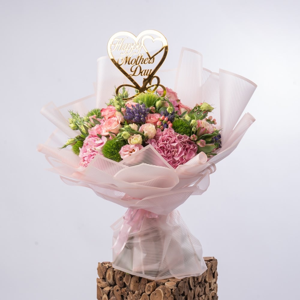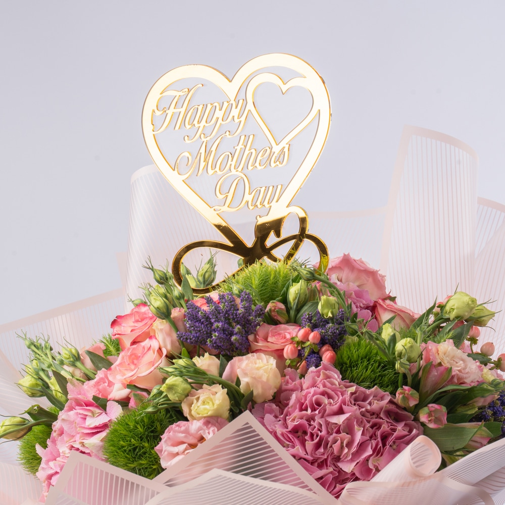 Hydrangea, Mattiola, Limonium, Eustoma, Pink Rose, Alstroemeria, Dianthus Green & Hypericum Pink with “Happy Mother’s Day” Acrylic Golden Badge