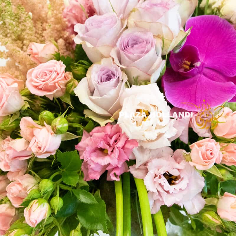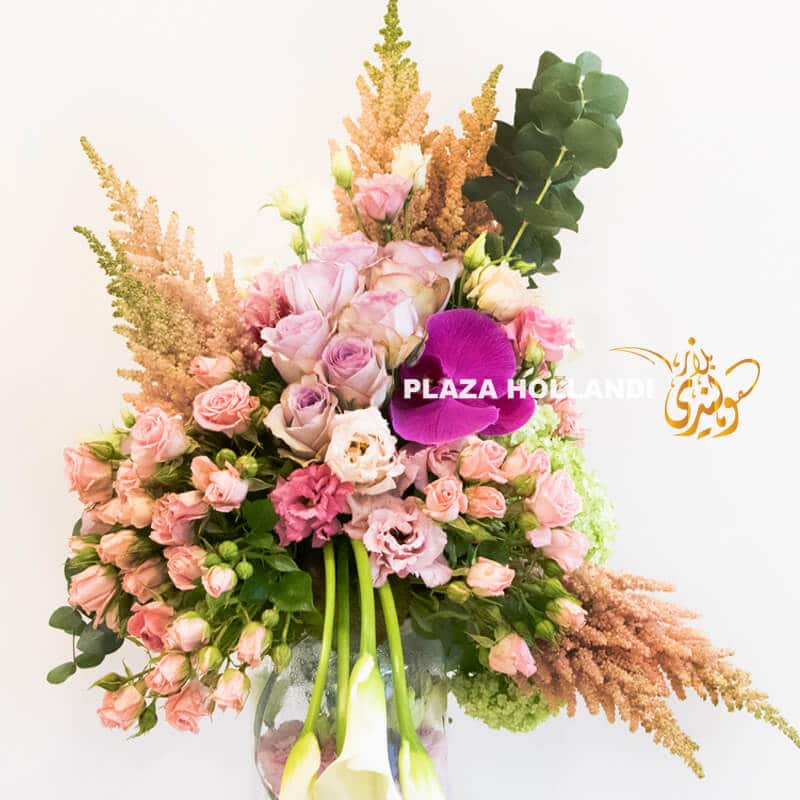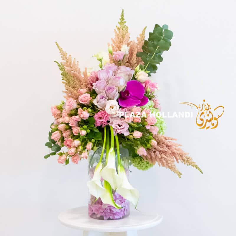 A beautiful arrangement of pink and purple flowers is uniquely arranged to create a stunning floral display. This design is made using pink spray roses, eustoma, astilbe, call lily, phalaenopsis orchids, roses, hydrangea and eucalyptus arranged in a glass vase. This flower arrangement is sure to make the recipient happy!