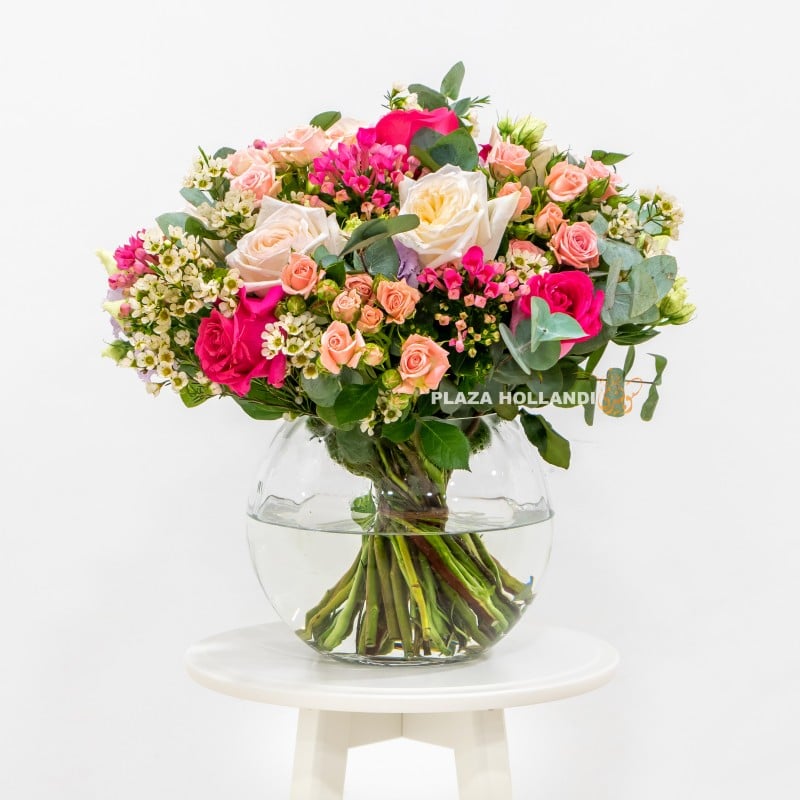 A stunning bouquet of pink and off white flowers with pink spray roses, roses, O’Hara scented roses, waxflower and eucalyptus arranged in a glass vase. This flower bouquet is perfect for any occasion and would be a beautiful gift to receive via same-day delivery. Order your flower bouquet today and we will take care of the rest.