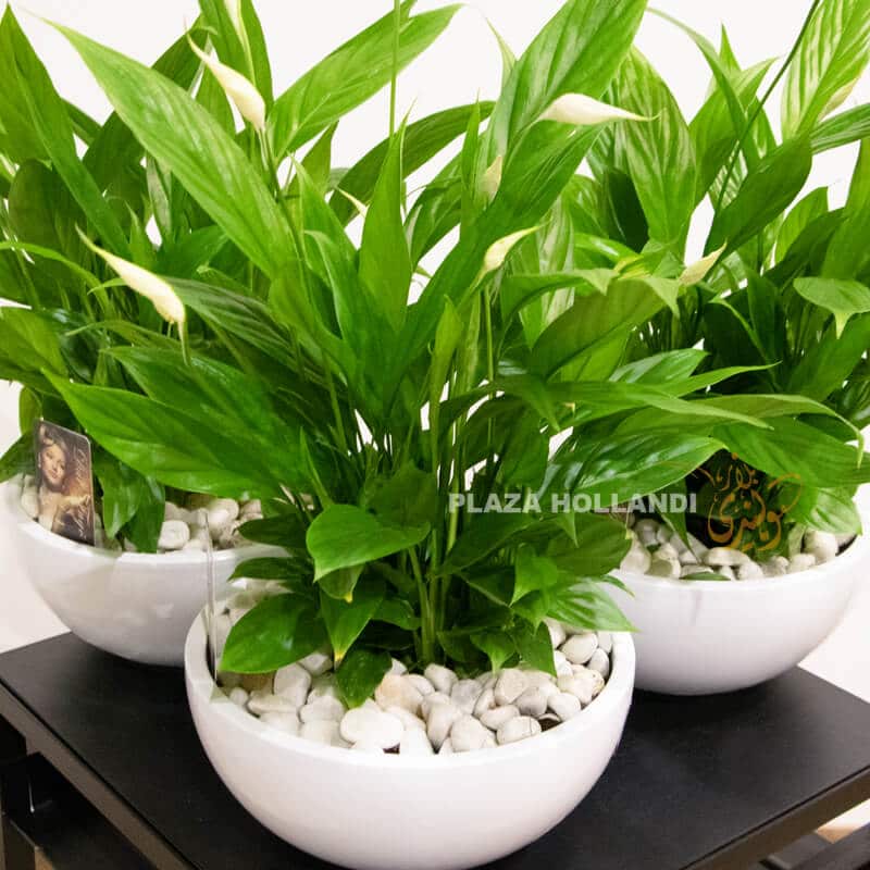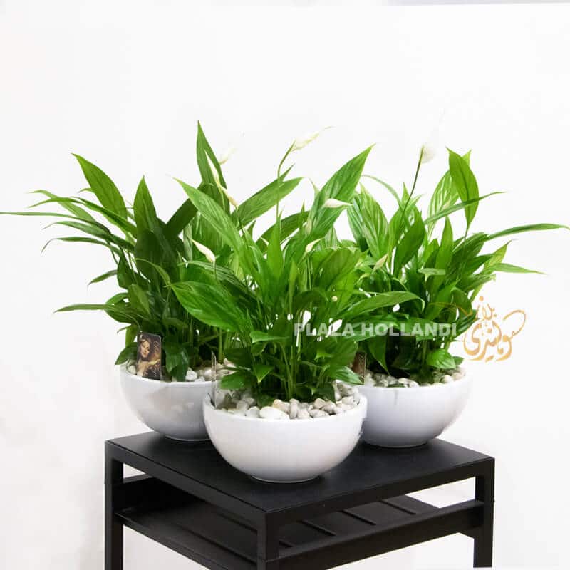 Three white spathiphyllum planted in white pots with white stones. These spathiphyllum, also known as peace lily’s are a wonderful plant to add to your indoor area. Suitable for low light and bright light these plants are easy to look after. They require water only when the leaves ‘droop’ a little. To ensure you continue to get white flowers fertilise once a month.