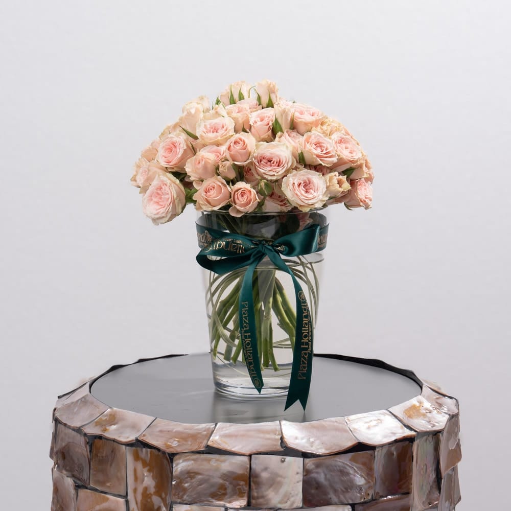 Peach Spray Roses in Glass Vase – 20 cm is a delicate and elegant floral arrangement curated by Plaza Hollandi UAE in Abu Dhabi. Featuring soft peach-colored spray roses artfully arranged in a clear glass vase, this composition exudes warmth, charm, and sophistication, making it a perfect gift or refined décor accent.