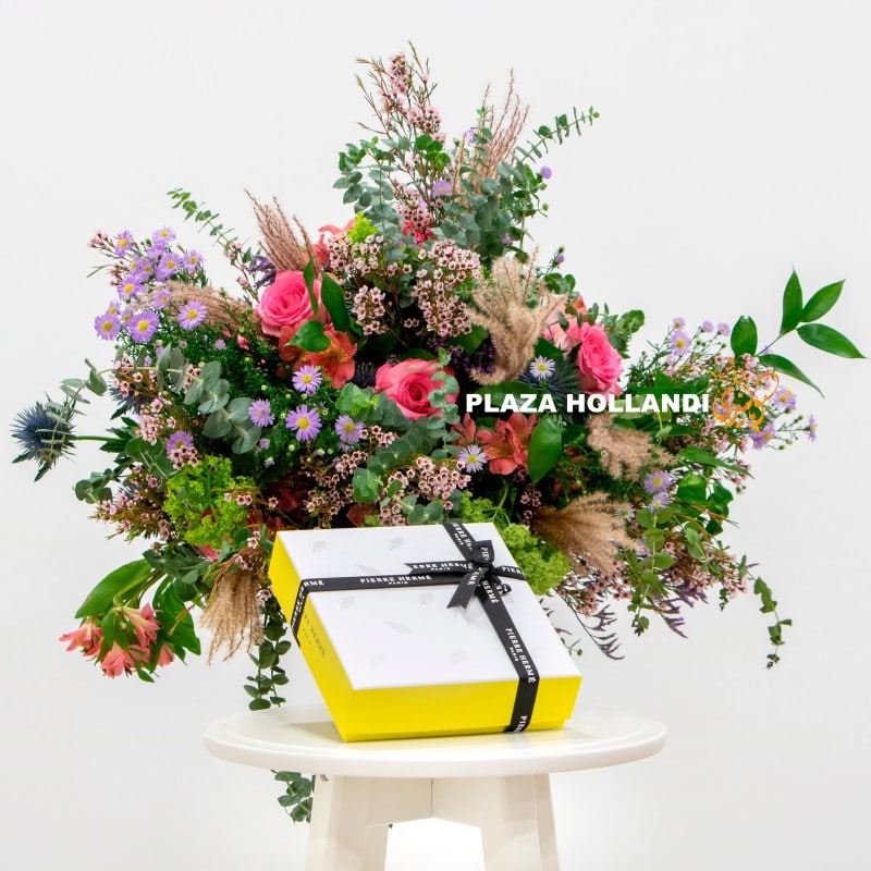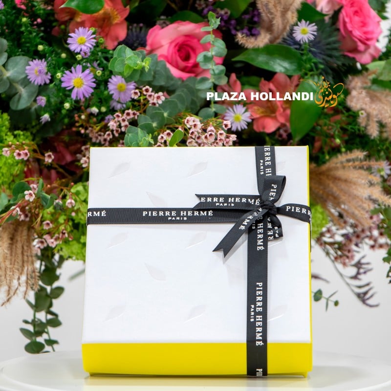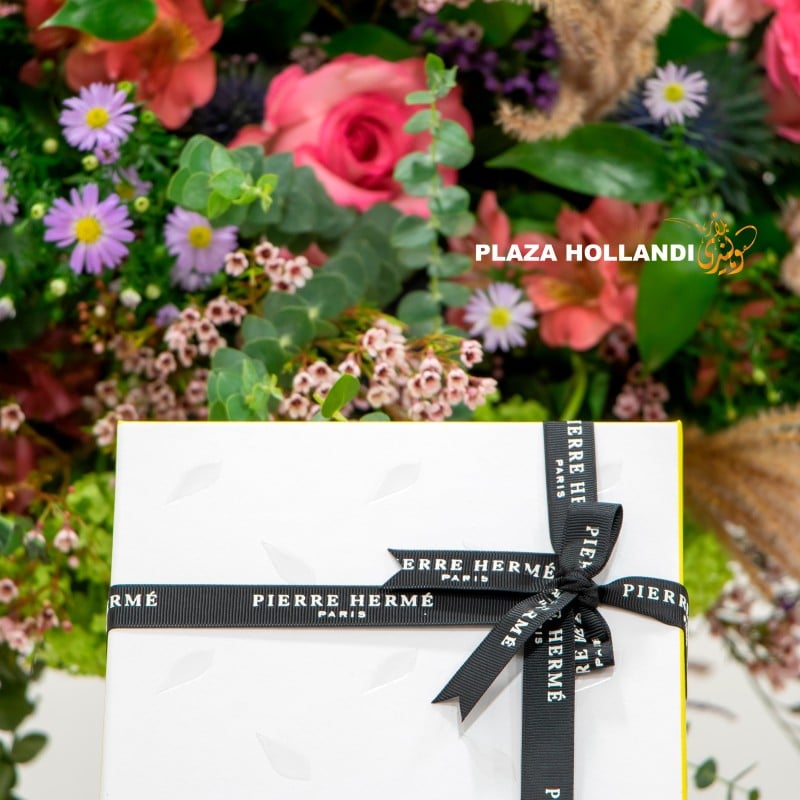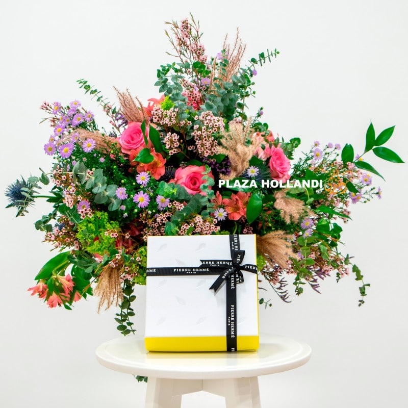 This combined gift of fresh flowers together with delicious sweet treats from Pierre Hermé are only available online at Plaza Hollandi. Voted ‘Best Pastry Chef in the World’ in 2016 and nominated the 4th most influential French personality in the world in the same year by Vanity Fair magazine, Pierre Hermé creates his own tastes and flavour combinations, just like an artist. A gift that will be remembered as a thoughtful idea to give as well as to receive.   A beautiful flower and chocolate combination.