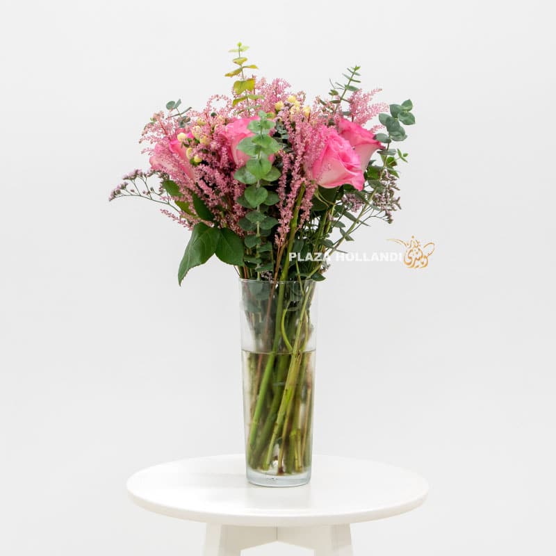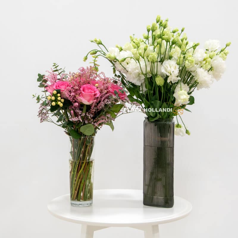 Pink Bouquet & White Eustoma in a Vase by Plaza Hollandi UAE is an elegant floral arrangement designed for clients in Abu Dhabi who appreciate gentle color balance and refined simplicity. Combining the warmth of pink blooms with the graceful purity of white eustoma, this composition creates a calm, sophisticated floral statement suited to luxury gifting and tasteful interiors.