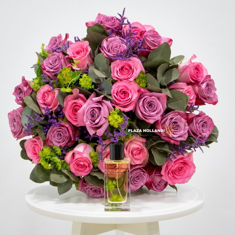 A beautiful bouquet made with pink and purple roses, limonium and mixed greenery paired with our Passionate Purple perfume to make a truly unique and beautiful gift.