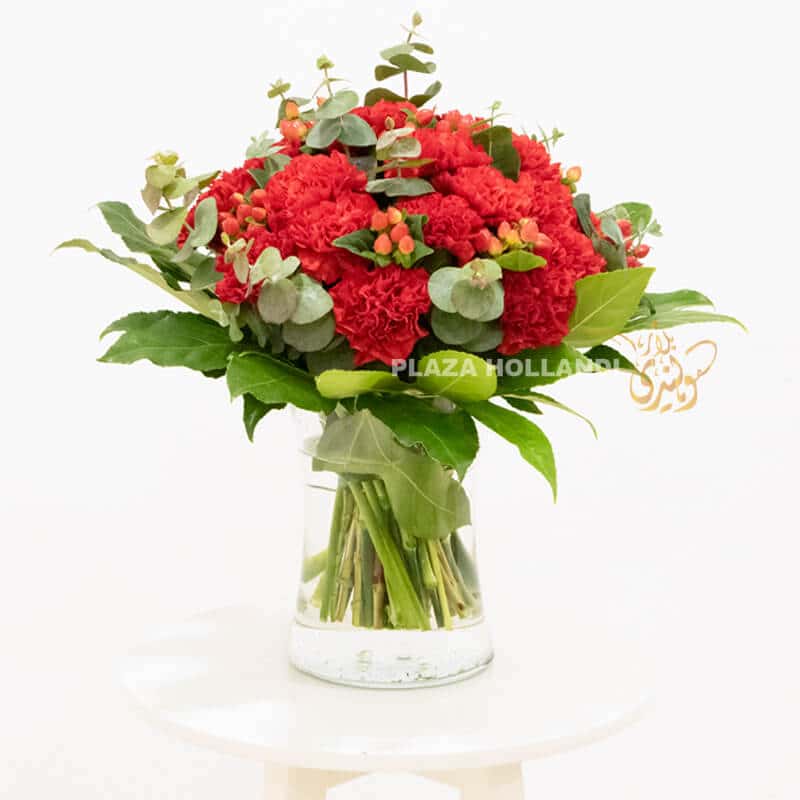 Carnations are known in the floristry world as the long lasting fresh flower.  This beautiful bouquet of red carnations, eucalyptus and red hypericum arranged in a glass vase, is a perfect alternative to a red rose bouquet and will last for at least a week. To help it to last longer change the water every two days and cut the stems at an angle and your flowers will give you days of joy! Order before 5 pm for same day delivery.