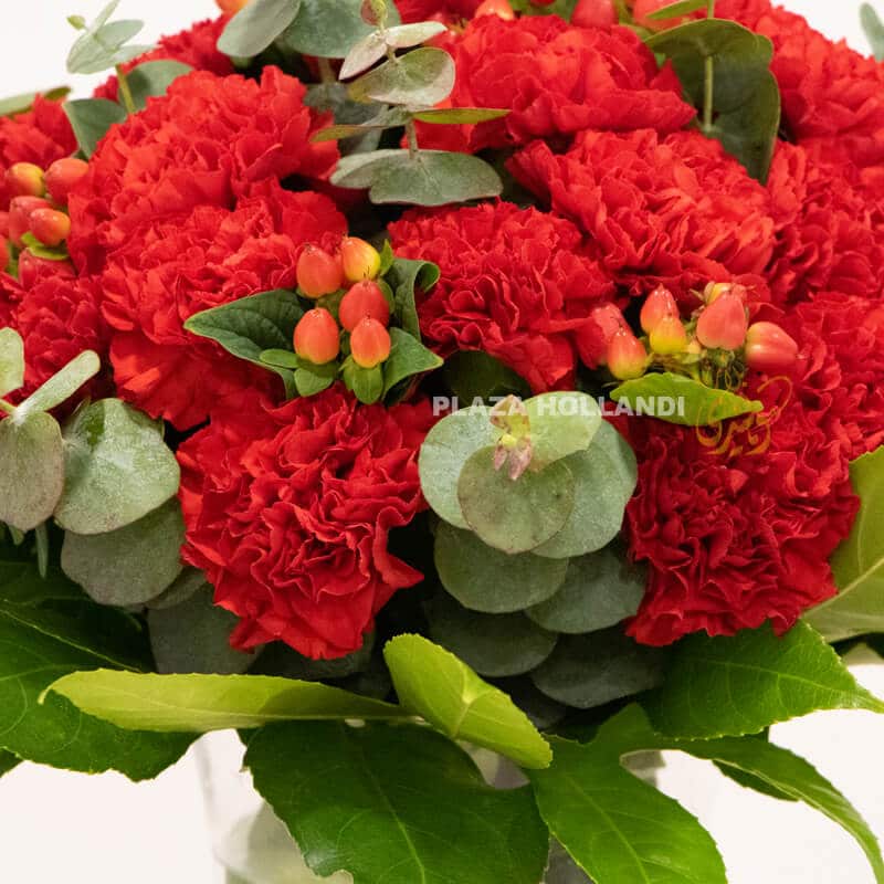 A beautiful bouquet of red carnations, eucalyptus and red hypericum. Perfect for any occasion.