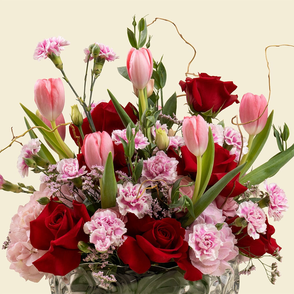 Red Roses, Tulips, Carnations & Limonium in Glass Vase ? H25cm